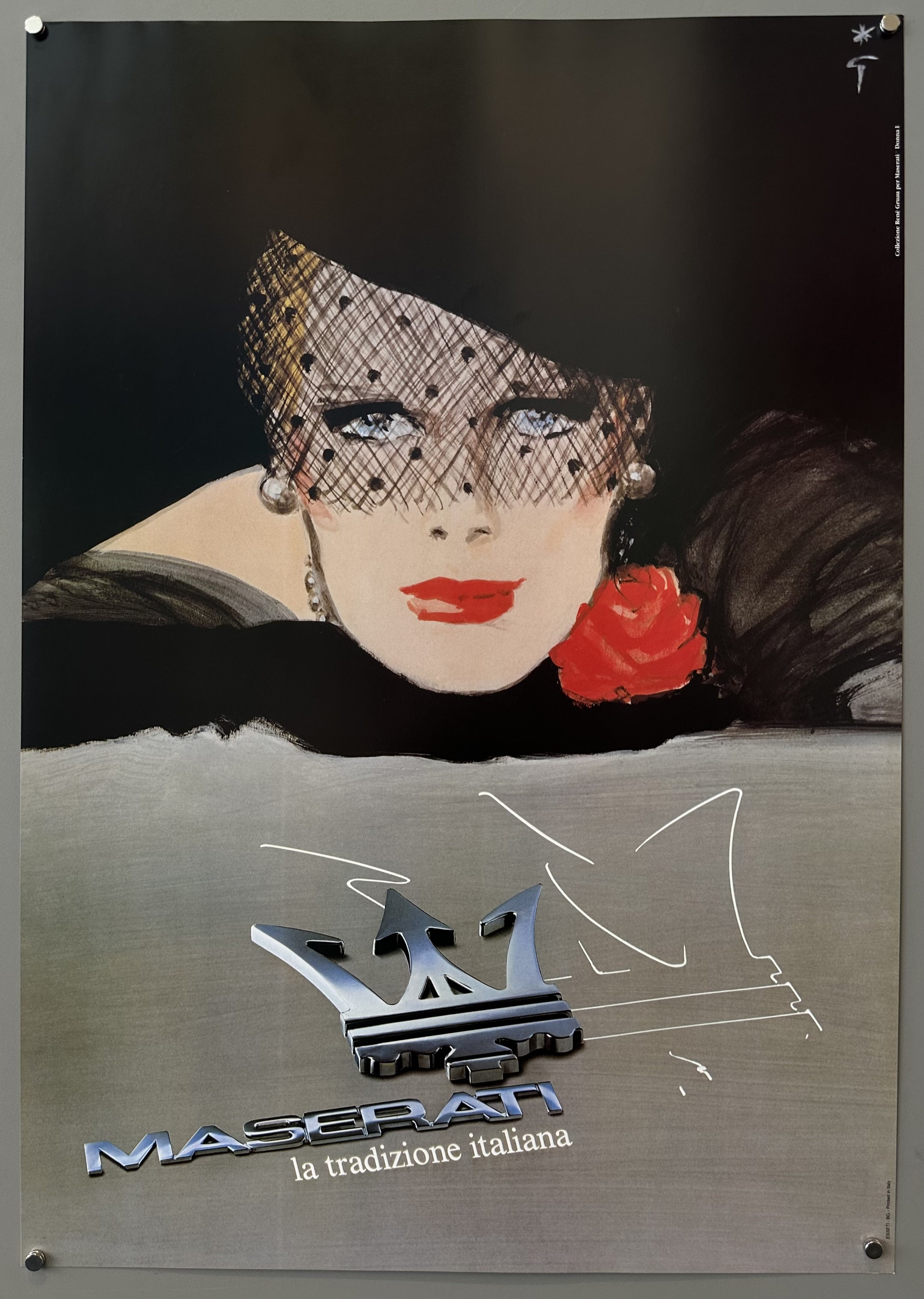 An advertisement for Maserati, this seductive woman looking at the viewer is distinctive of Gruau's works.