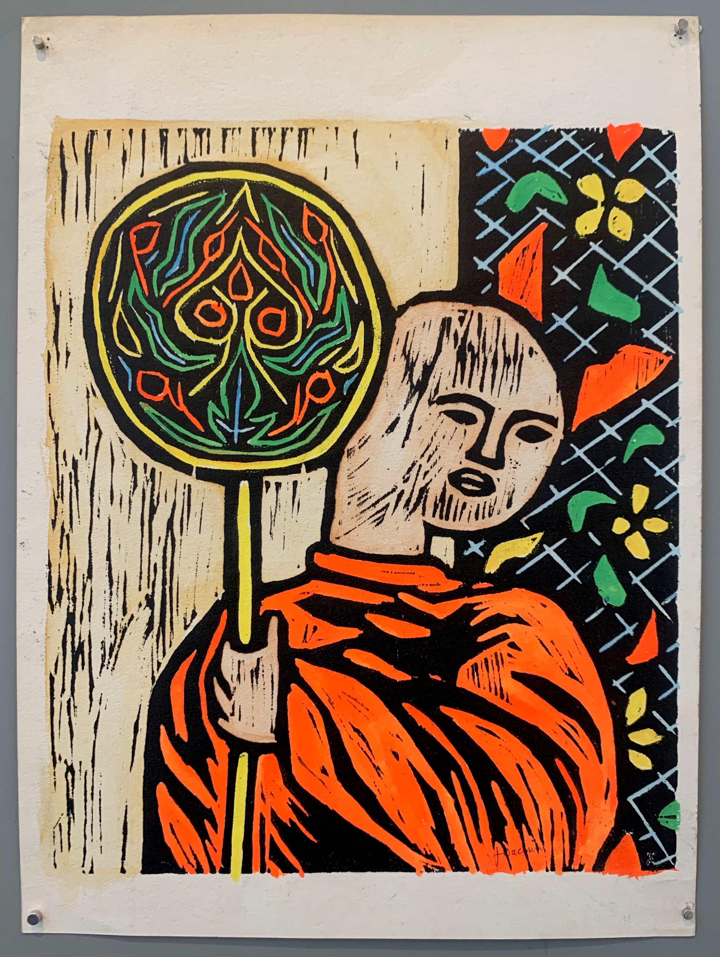 Joaquim Pedro Ribeiro Araujo was a Brazilian artist prominent in the 1960s. He worked with a wide variety of mediums including oils, tempera, ink, and woodblocks. Joaquim surrounded himself with fellow avant-garde artists of the time, including Brazilian modern artists Amilcar de Castro and Helio Oiticica. He studied art in Sao Paulo before moving to Japan where he was introduced to woodblock prints, by which he was greatly inspired. He spent a lot of time in Asia, moving to Bangkok, Thailand, where he started writing opinion pieces for the Bangkok World, climbing the art world ladder. He released his manifesto which focused on the concept of ephemerality—he believed that values are inadequate because time is always changing, therefore one should follow their own beliefs. Opposed to everything popular, Joaquim wanted to challenge the status quo and break the beatnik artist stereotype saying, “my paintings are not just for decoration in the living room. I paint to create a universe.” His works are centered around people he saw in Japan, Thailand, Singapore, Malaysia, and Pakistan, all places where he held well-received exhibitions. He became the first South American to exhibit in Southeast Asia and the first Brazilian to exhibit in Pakistan. Though Joaquim’s works were visually bizarre at times or difficult to grasp, it was hard to critique a man who held such powerful faith in his own work and believed that nothing is unchangeable, even woodblock pieces.