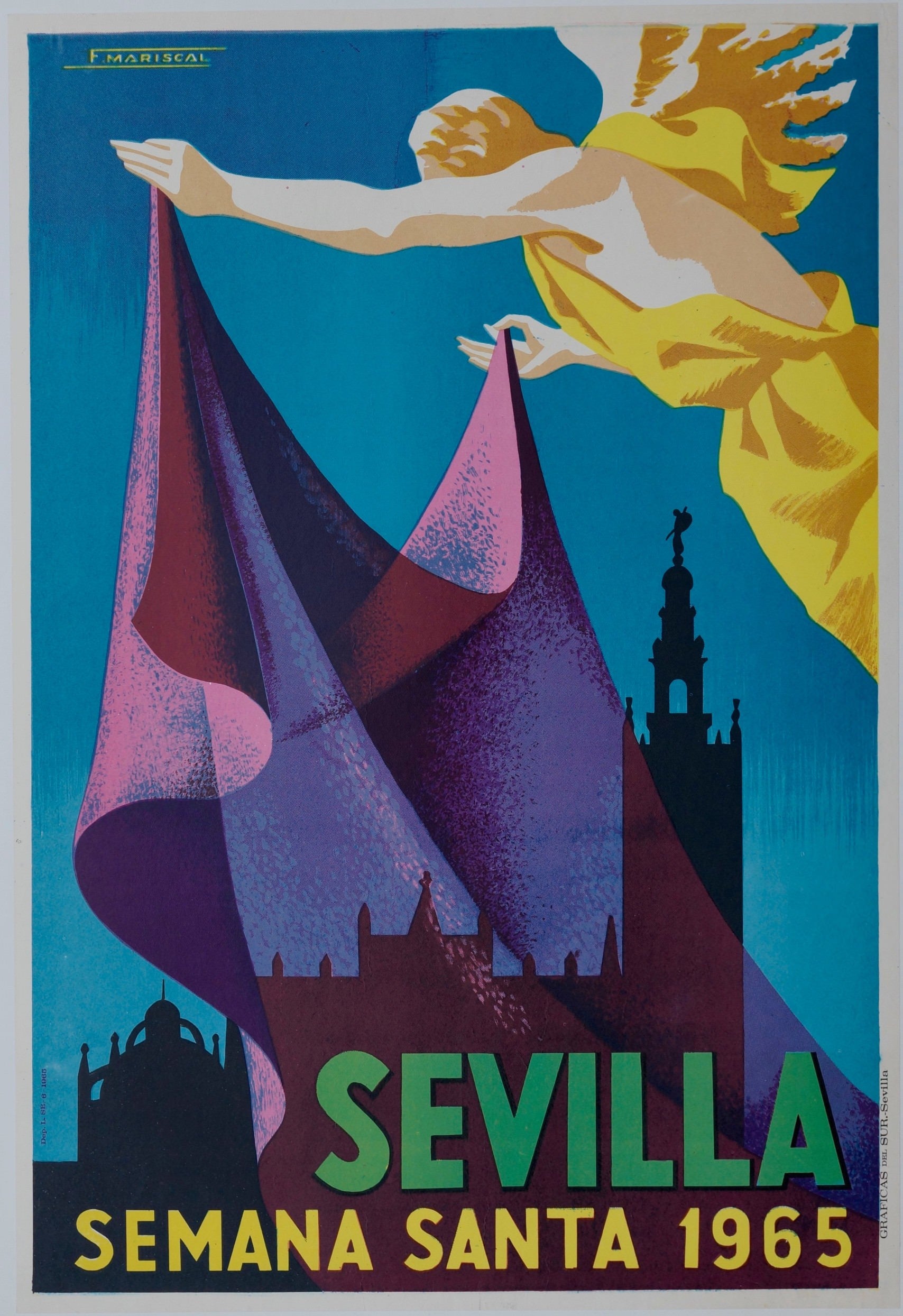 This poster, advertising Holy Week in Seville, features an angel that appeares to be covering the city. Holy Week is a Christian celebration the week prior to Easter, and in Seville it represents one of the largest festivals, complete with a massive parade of floats depicting biblical scenes.