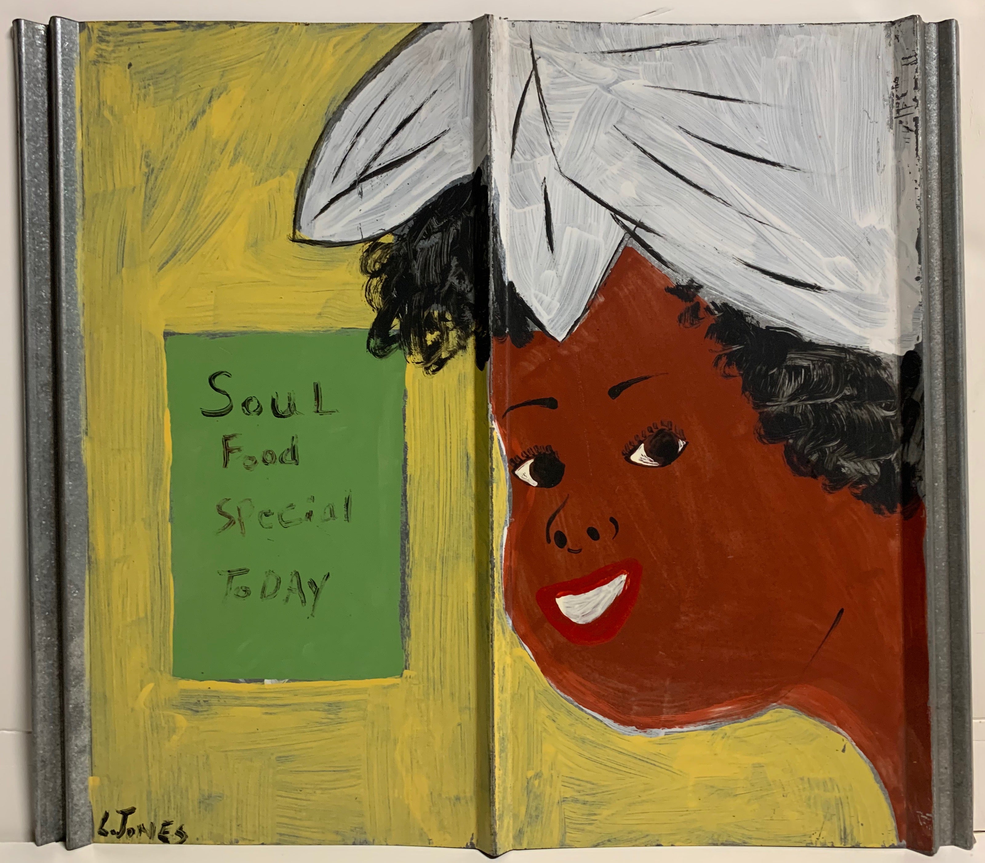 A Georgia local, Leonard Jones taught himself to paint when he was in high school. His works are greatly inspired by scenes from his childhood, images of rural living in the South including housewives, church-goers, and laborers. A folk artist who is often considered outsider, Jones paints to capture candid daily life and the beauty found in the community around him. The use of scrap wood or tin roofing alludes to the buildings he grew up with, and he often incorporates these materials into the paintings themselves. The materials are covered in bold backgrounds of color, which Jones paints subjects over using his fingers or the handles of brushes, leaving a distinctly Leonard Jones work of art.