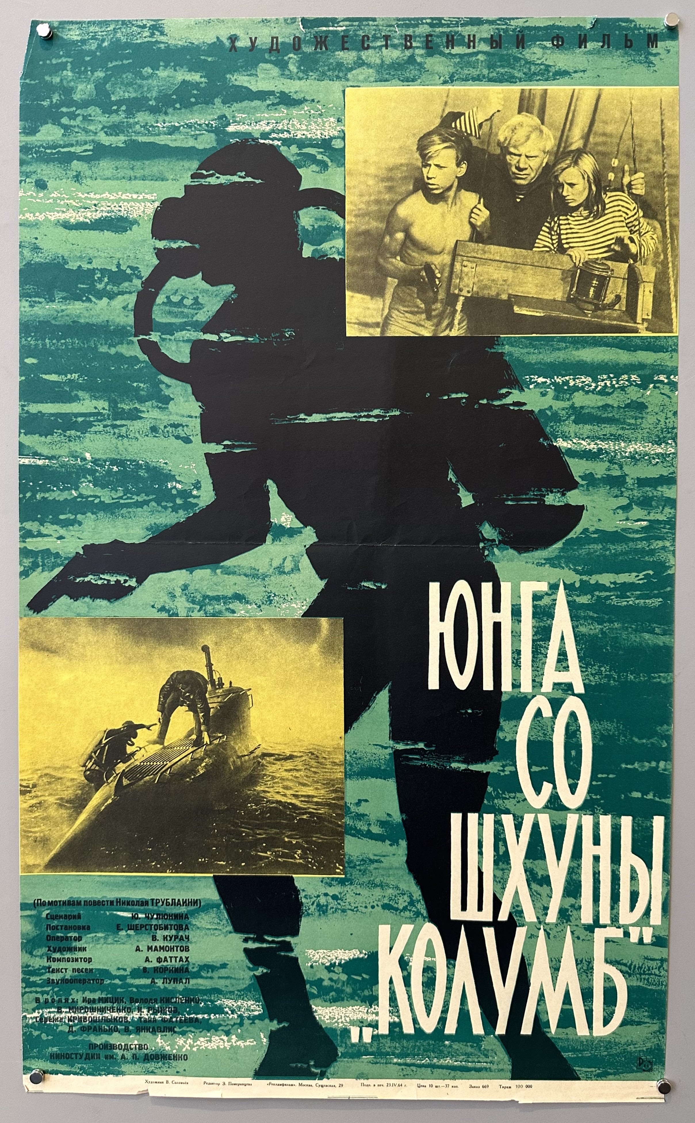 Poster featuring a scuba diver by Solovyov V.V. 1964 for a feature film based on a story by Nikolai Trublaini. Starring Ira Mitsik, Volodya Kislenko, V. Miroshnichenko, I. Ryzhov, Seryozha Krivoshlykov, Tanya Fateyeva, D. Franko, V. Yannavtivis.