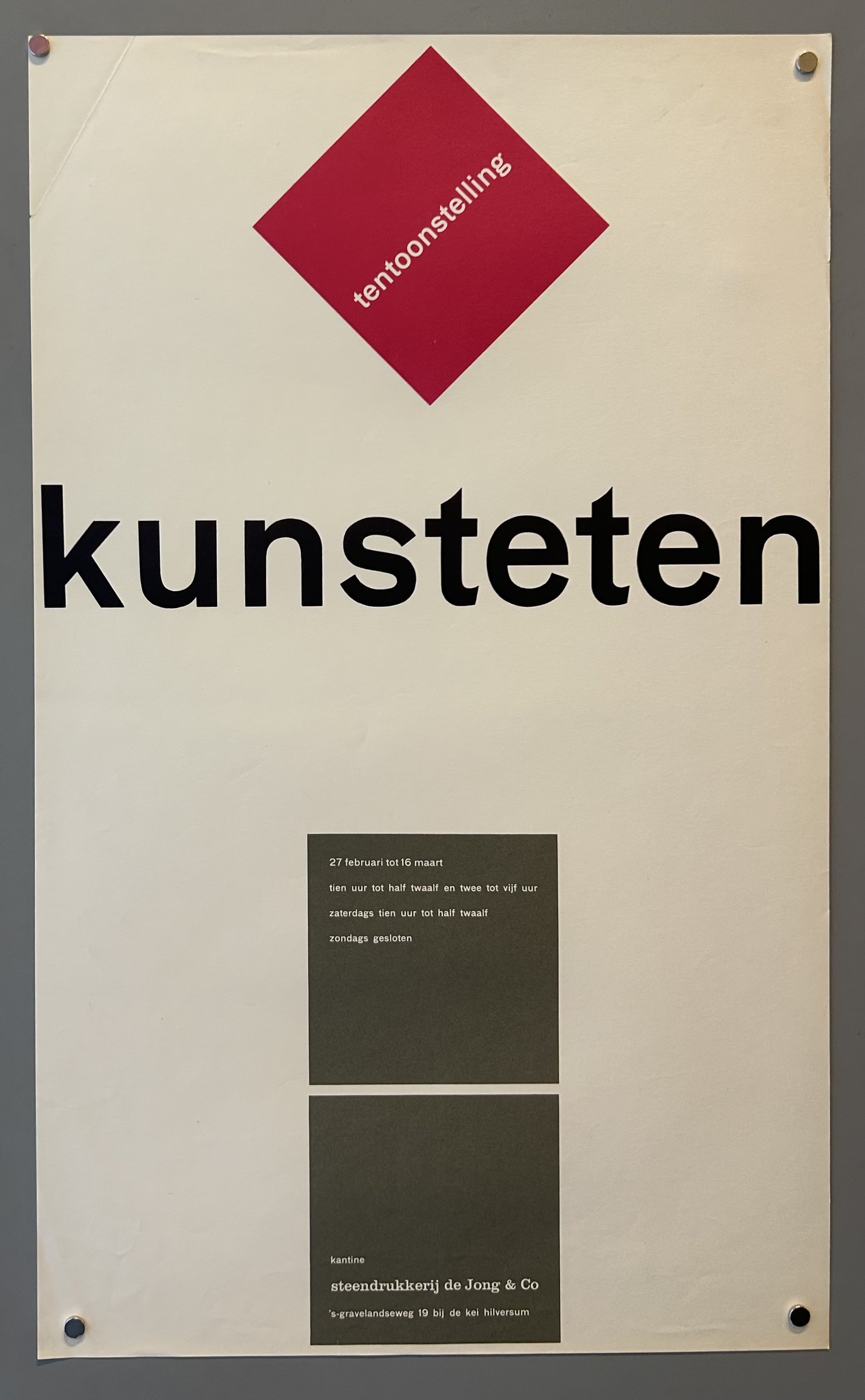 This print comes from a series of exhibitions at the de Jong & Co gallery. Jong & Co was a mid-century modern Dutch graphic design and printing company, known for their minimalist, yet vibrant, prints. During the 1950s and 1960s, De Jong & Co. experimented with printing techniques that made their lithographic printing internationally famous.