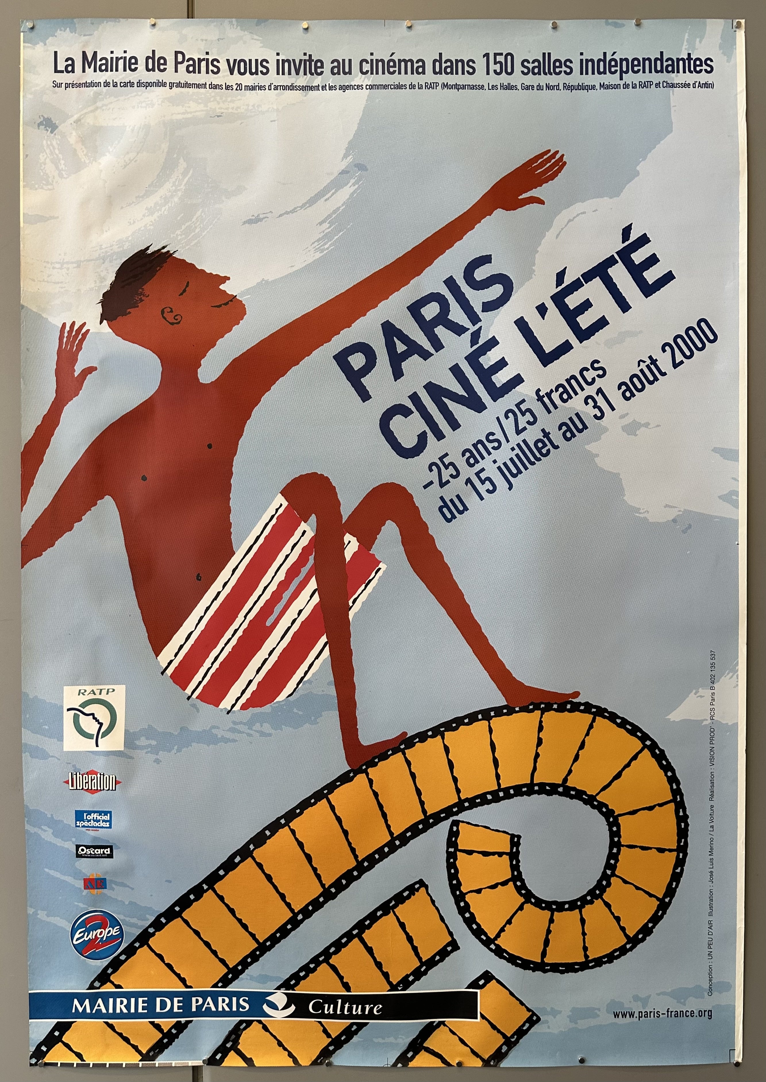 English translation: "Paris City Hall invites you to the movies in 150 independent cinemas / Paris Cinema Summer"