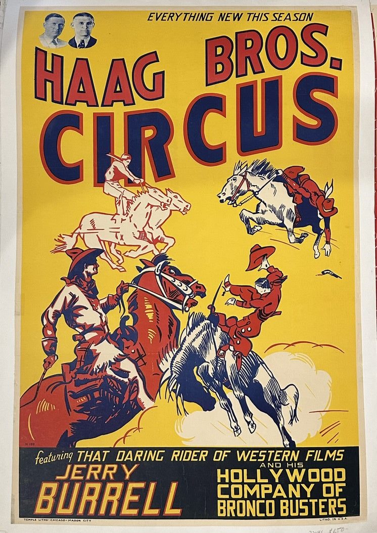The Haag Bros. Circus, featuring Jerry Burrell, described as "THAT DARING RIDER OF WESTERN FILMS" and his "HOLLYWOOD COMPANY OF BRONCO BUSTERS