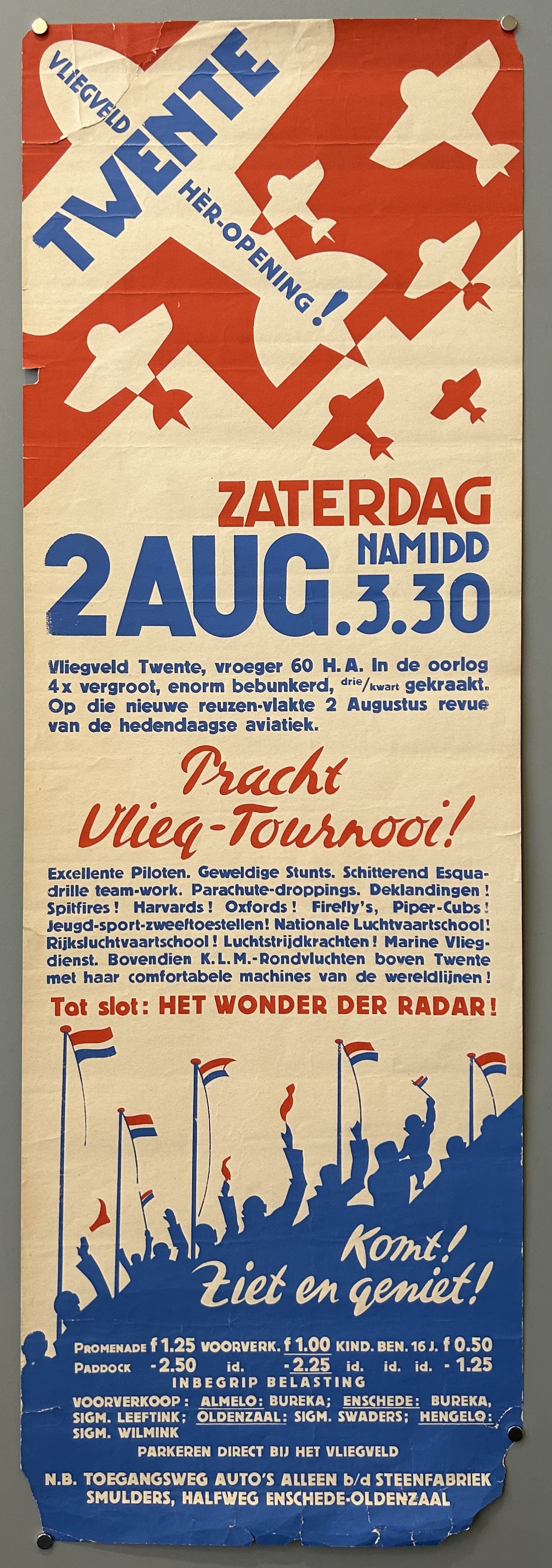 Promoting the Twente Airport reopening in Enschede, complete with a flying competition and more. At at time when planes were a relatively new invention, this event would have been highly sought after.
