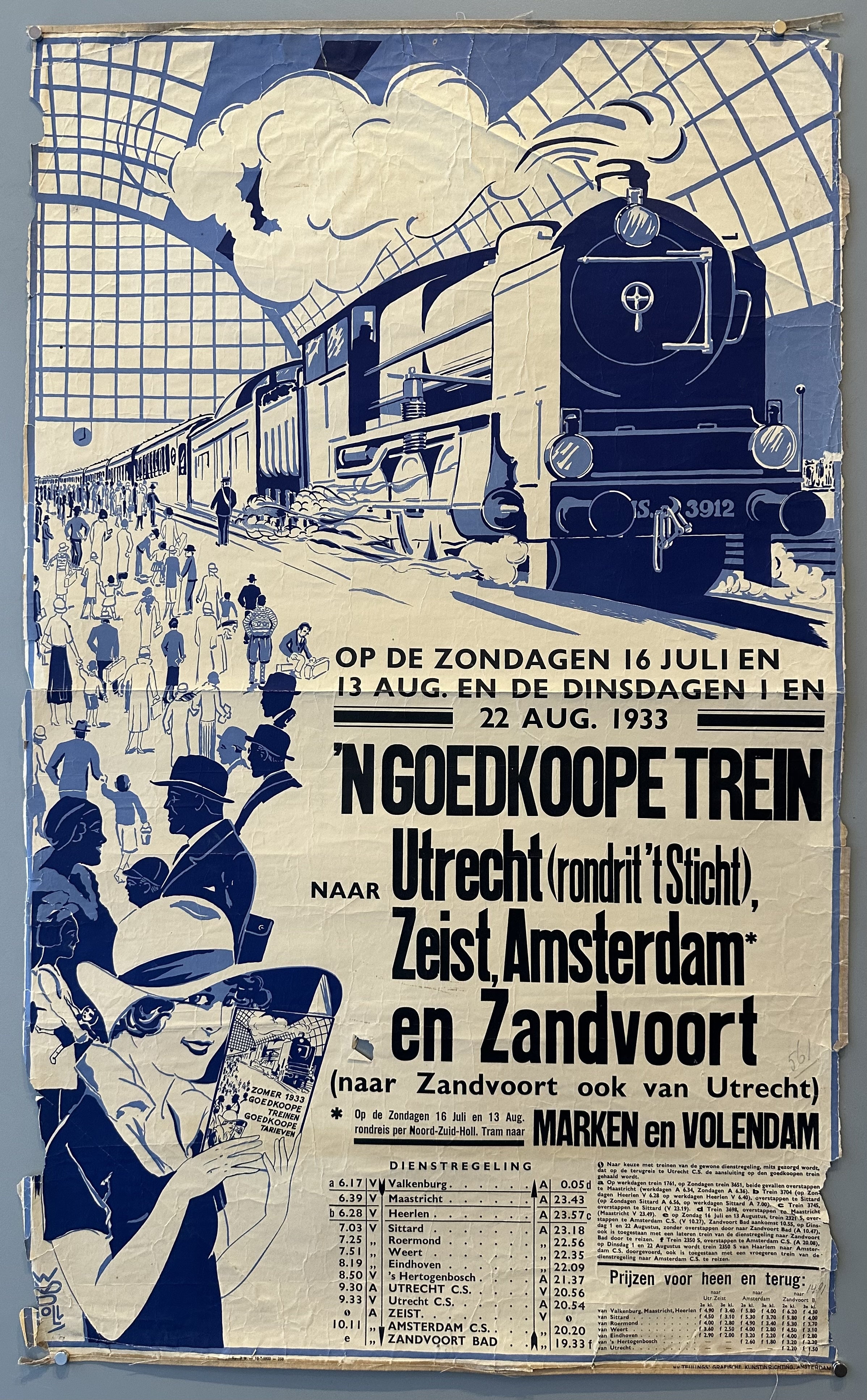 English translation: "ON SUNDAYS 16 JULY AND 13 AUG. AND TUESDAYS 1 AND 22 AUG. 1933 / CHEAP TRAIN TO Utrecht (round trip to Sich), Zeist Amsterdam and Zandvoort / (to Zandvoort also from Utrecht)"