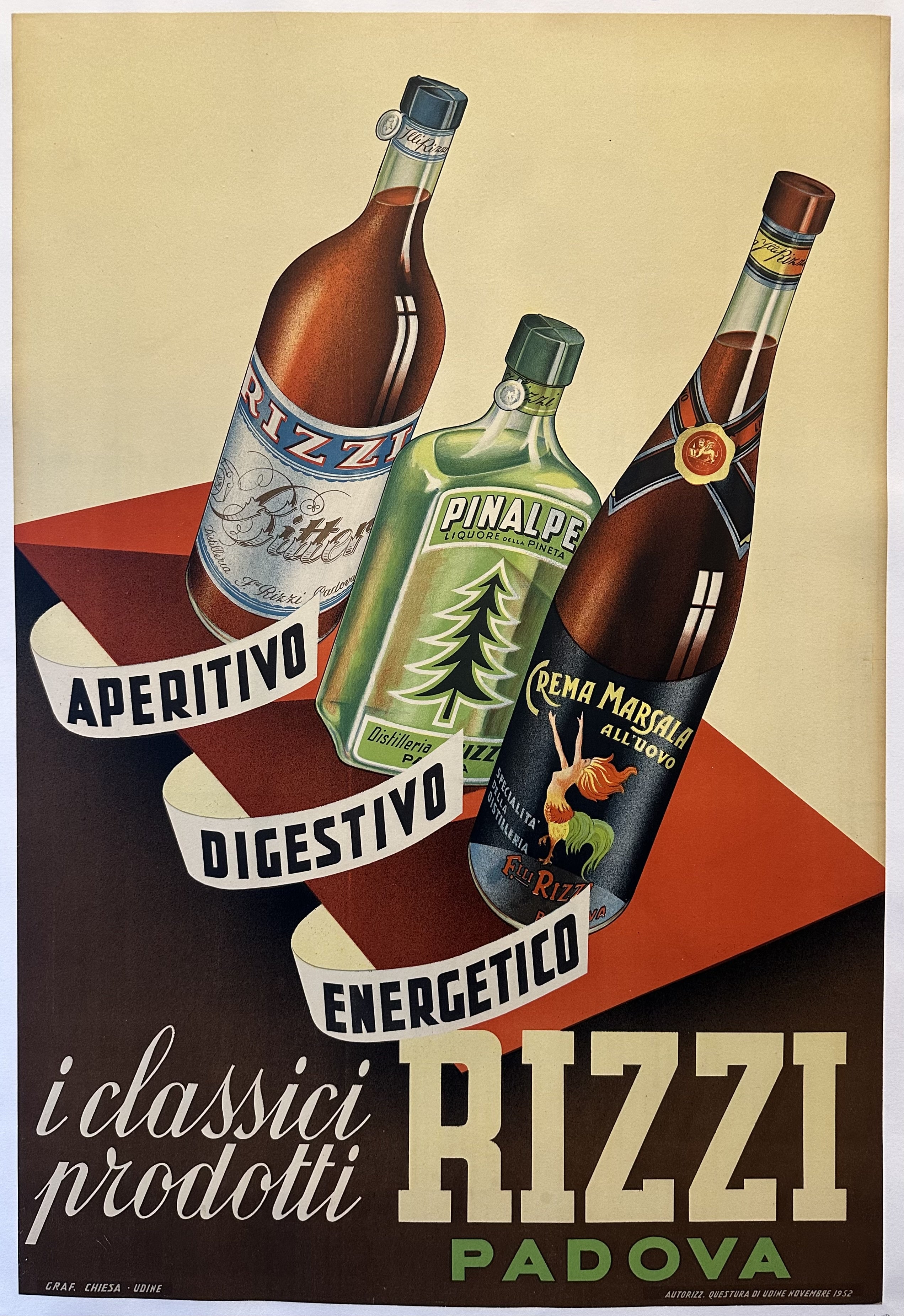 Vintage advertising poster for the liqueurs and aperitifs from Rizzi Padova. The three products shown are Rizzi Bitter, Pinalpe, and Crema Marsala All'Uovo.
