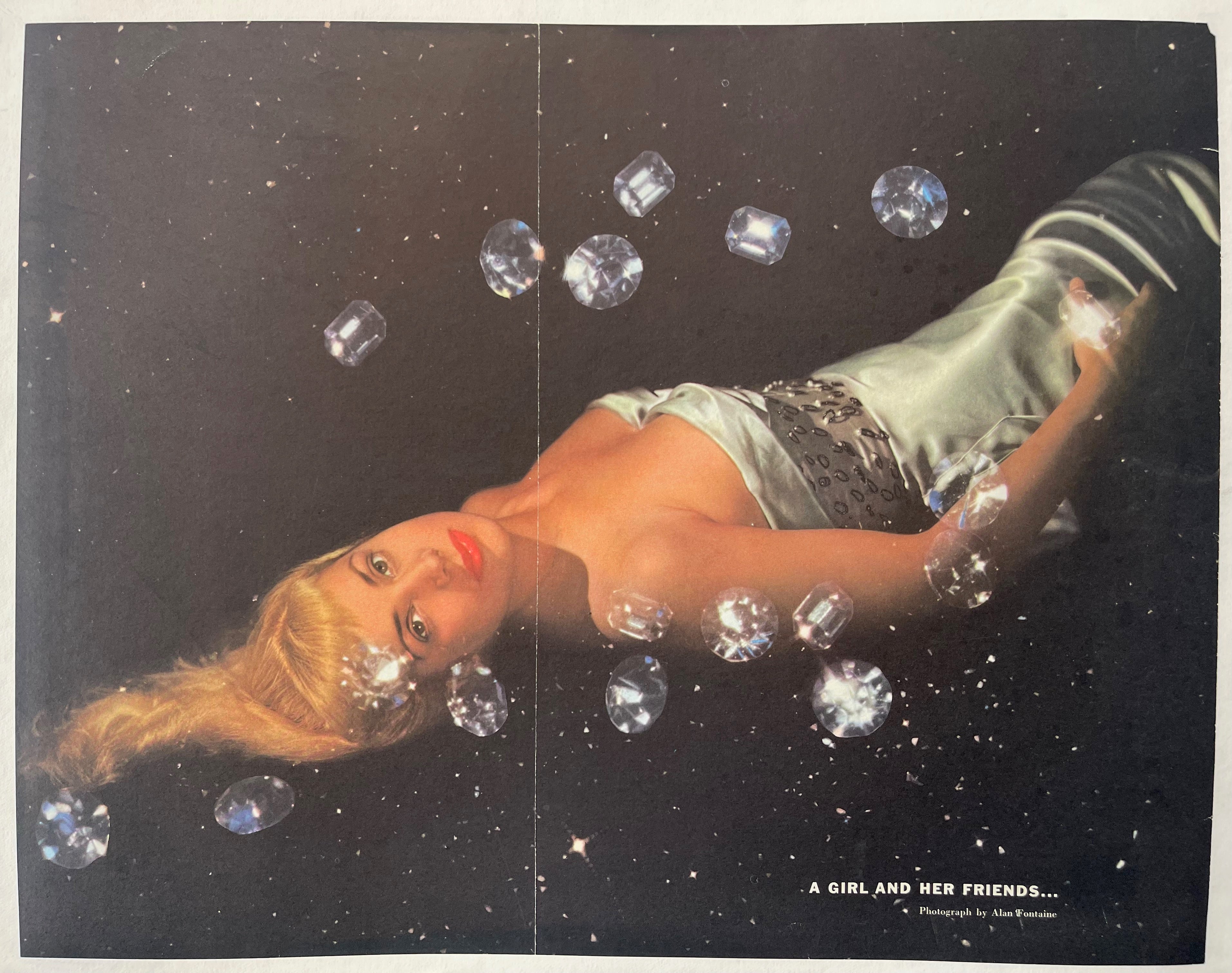 The original publisher of this poster is unknown, but the photograph itself is a glamorous image of a woman surrounded by diamonds in an elegant white dress.