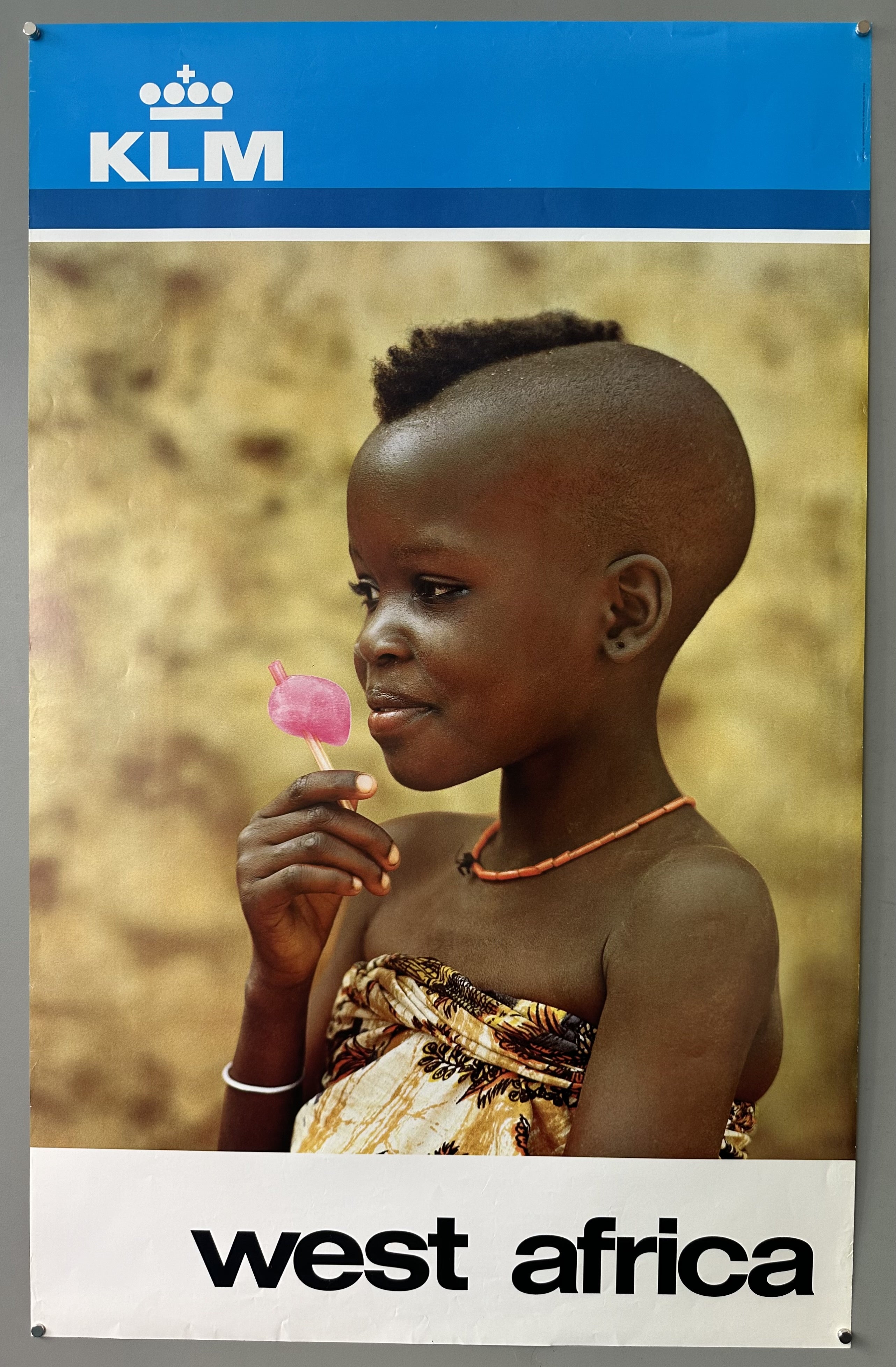This is promoting KLM Royal Dutch Airlines, the flag carrier of the netherlands. This is showing a little girl in west Africa smiling while holding a pink popsicle.