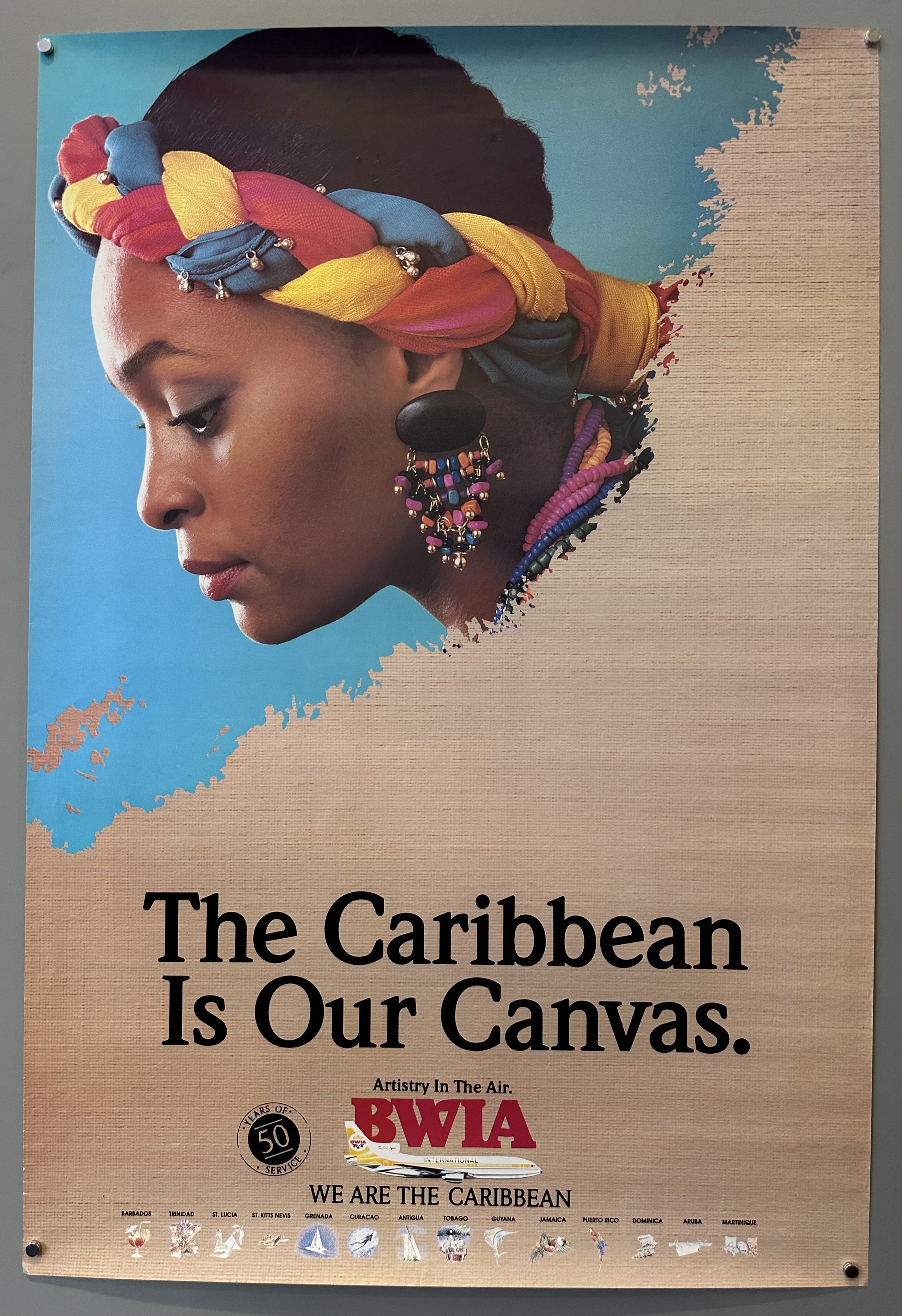 This is an advertisment for the British West Indiean Airways. you can see a woman wearing very festive earrings and braided headpiece. This is showing off the places in the Caribbean that can be visited using BWIA.