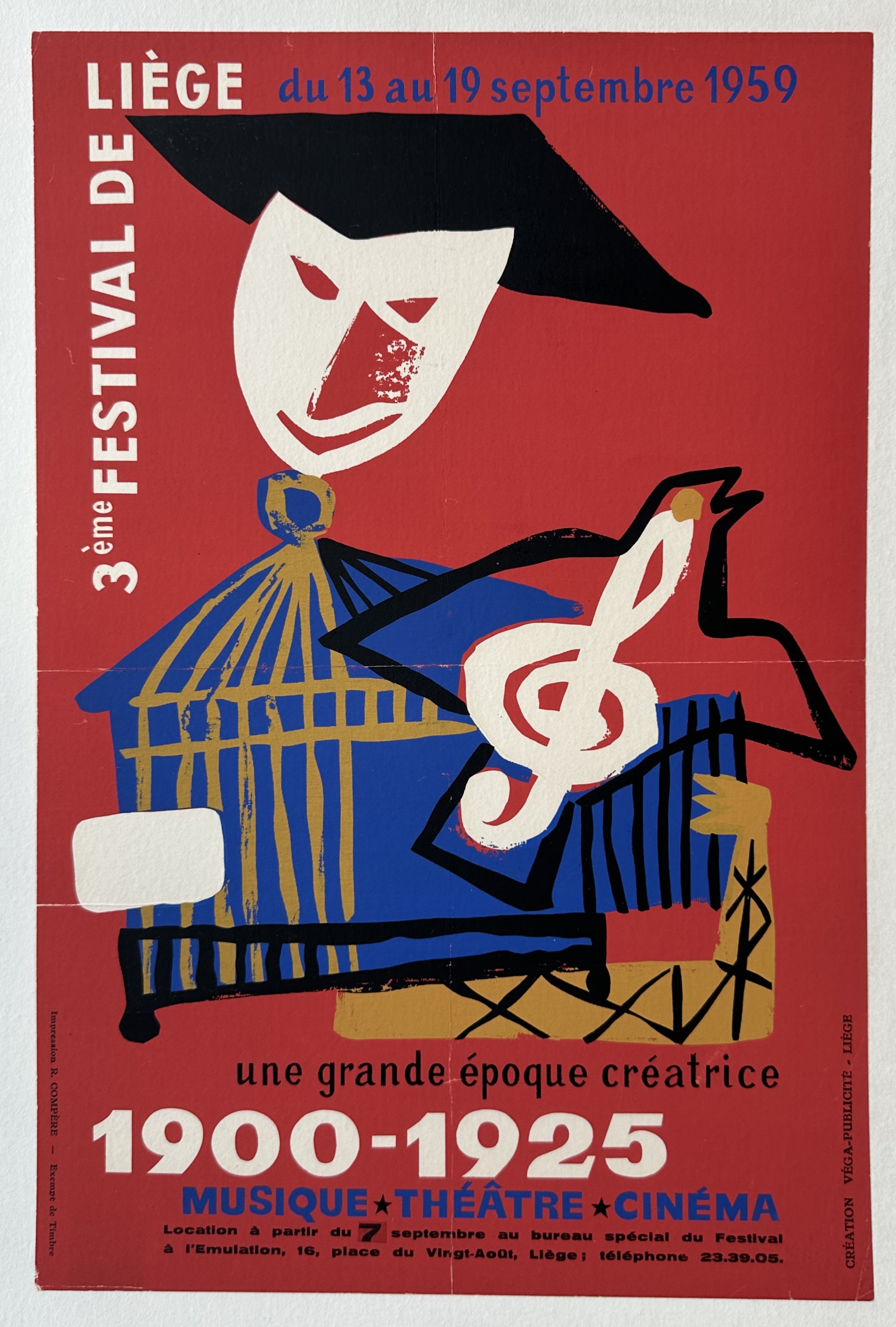 English translation: 3rd Festival Of Liege from september 13th to 19th 1959 - a great creative era 1900-1925. Music - Theatre - Cinema. Tickets on sale from september 7th at the special festival office at I'emulation, 16, place of August 20, Liège: telephone 23.39.05.