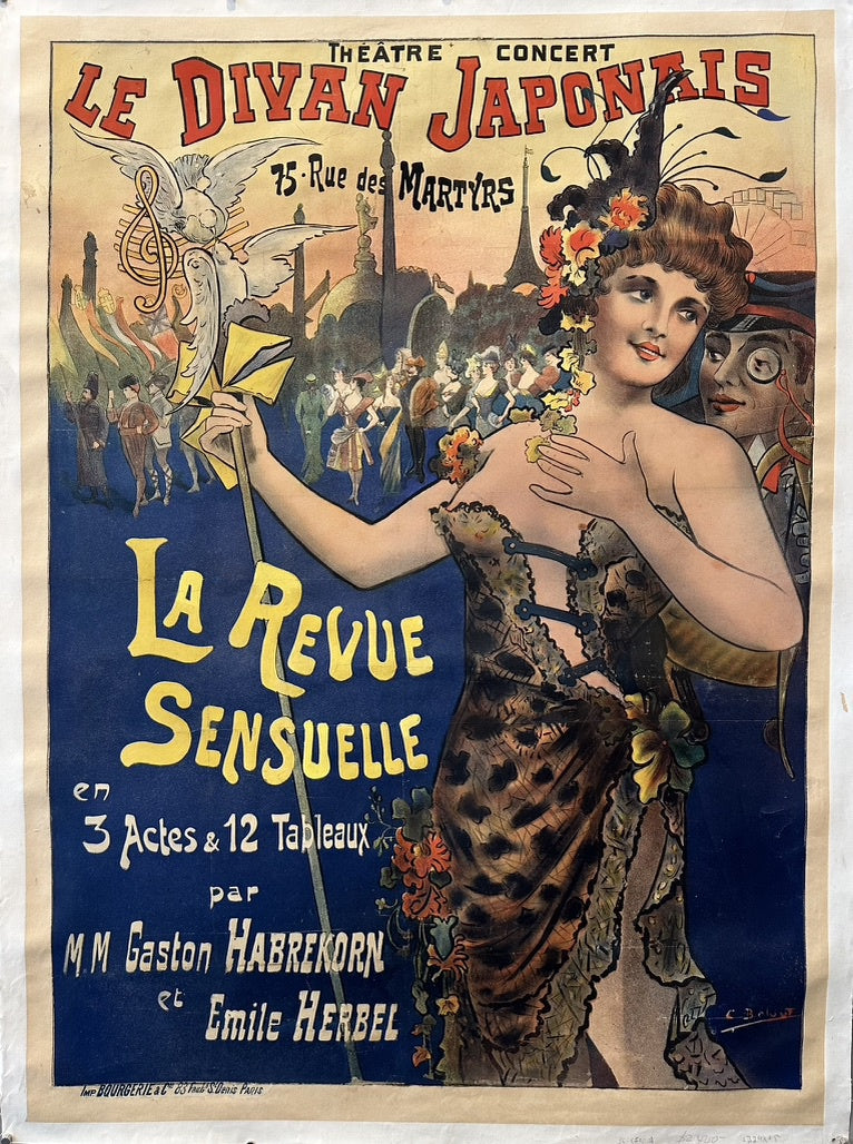 A cabaret show titled "La Revue Sensuelle" was performed at "Le Divan Japonais" described as being in 3 Acts & 12 scenes Printer: Bourgerie - Paris