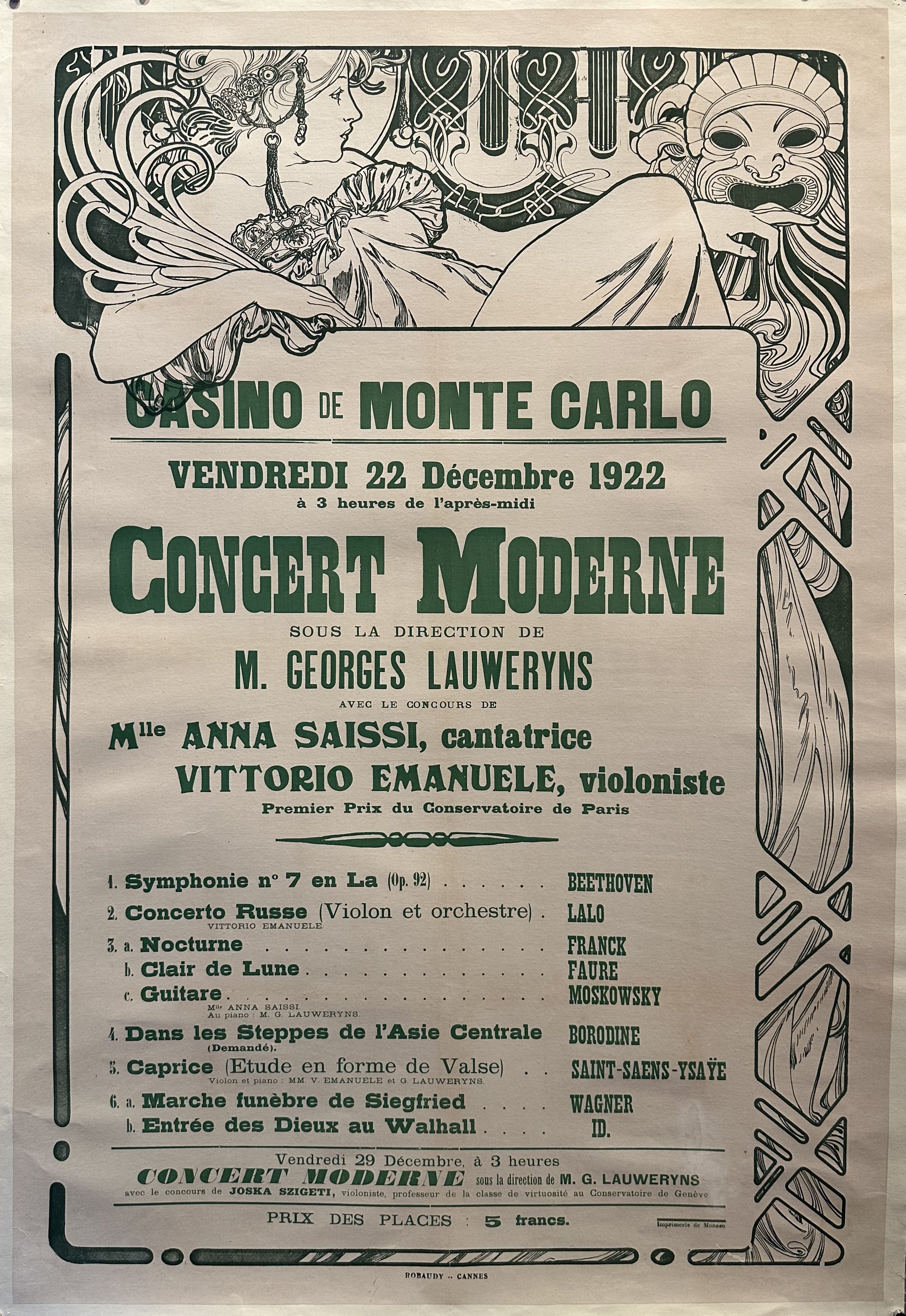 English translation: "CASINO DE MONTE CARLO / FRIDAY 22 December 1922 at 3 p.m. MODERN CONCERT / UNDER THE DIRECTION OF MR. GEORGES LAUWERYNS / WITH THE ASSISTANCE OF Ms. ANNA SAISSI, singer VITTORIO EMANUELE, violinist / First Prize at the Paris Conservatory / Friday 29 December, at 3 p.m. / MODERN CONCERT under the direction of MR. G. LAUWERYNS with the assistance of JOSKA SZIGETI, violinist, professor of the virtuosity class at the Geneva Conservatory / TICKETS 5 francs.".