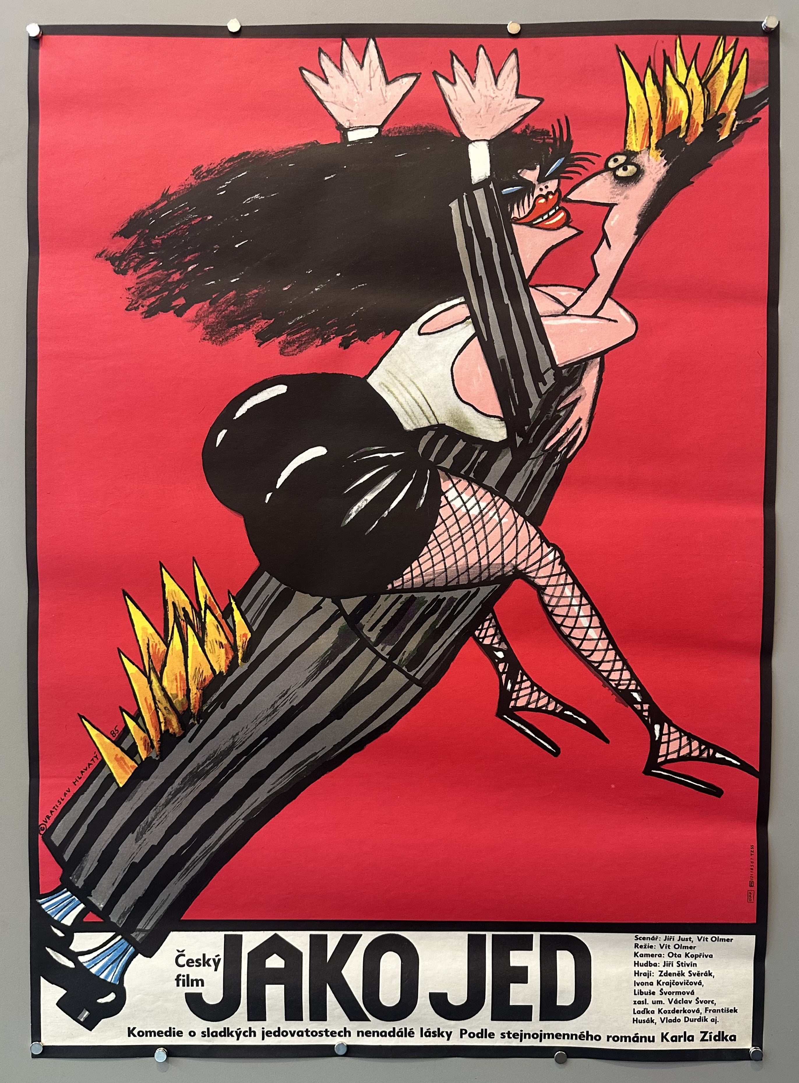 English translation: "Czech film JAKO JED / Comedy about the sweet poisons of sudden love Based on the novel of the same name by Karel Zídek / Screenplay: Jirt Just, Vit Olmer / Director: Vit Olmer / Camera: Ota Kopriva / Music: Jiri Stivin / Actors: Zdenēk Sverák, Ivona Krajcovicovd, Libuse Svormova zasl. um. Václav Svorc, Ladka Kozderková, Frantisek Husák, Vlado Durdik, etc."