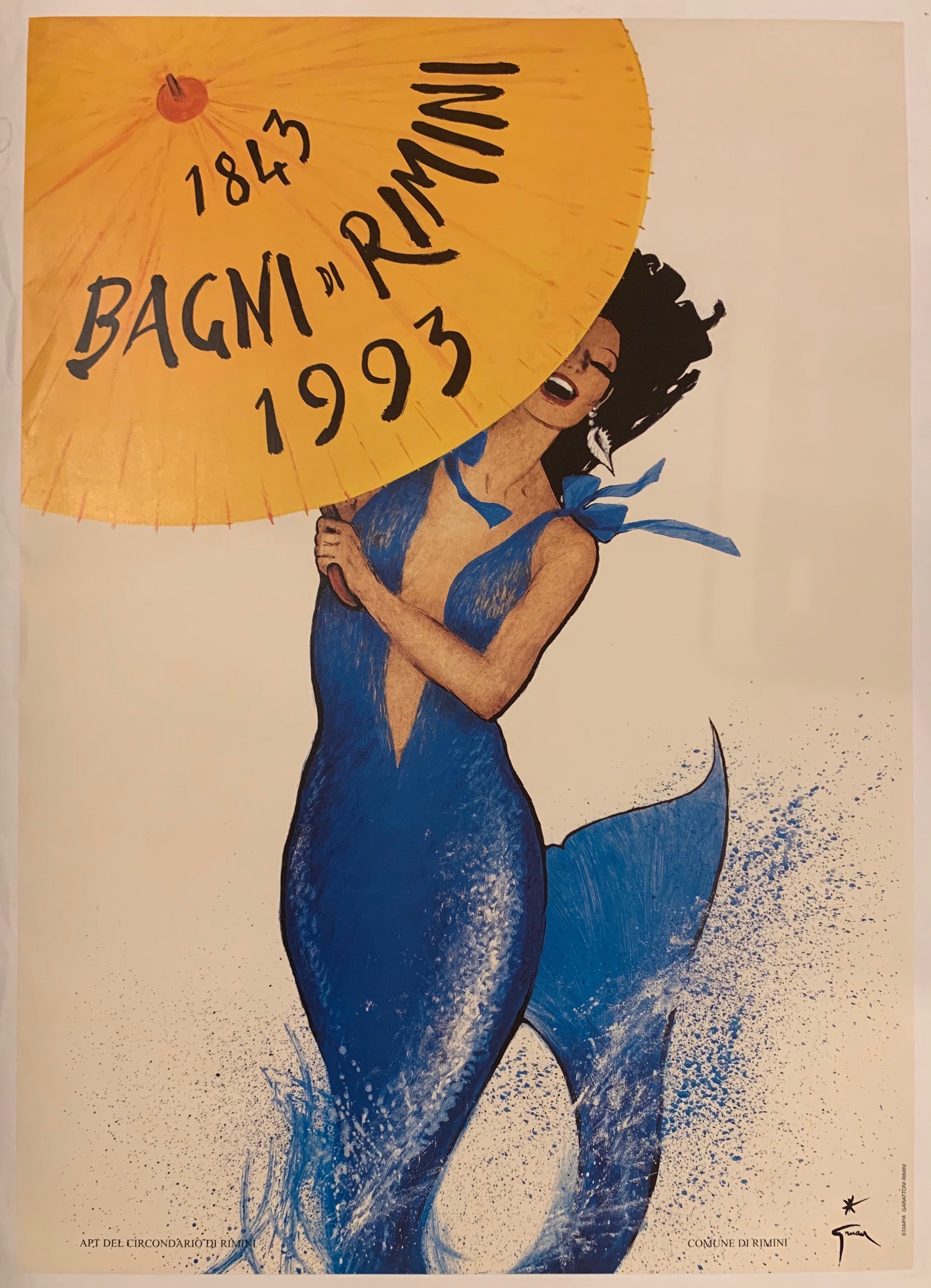 This beautiful poster advertises 150 years of the baths in Rimini, an Italian seaside town known for its crystal-clear mediterranean water. This mermaid in a royal blue holds up a yellow parasol, the colors of Rimini.