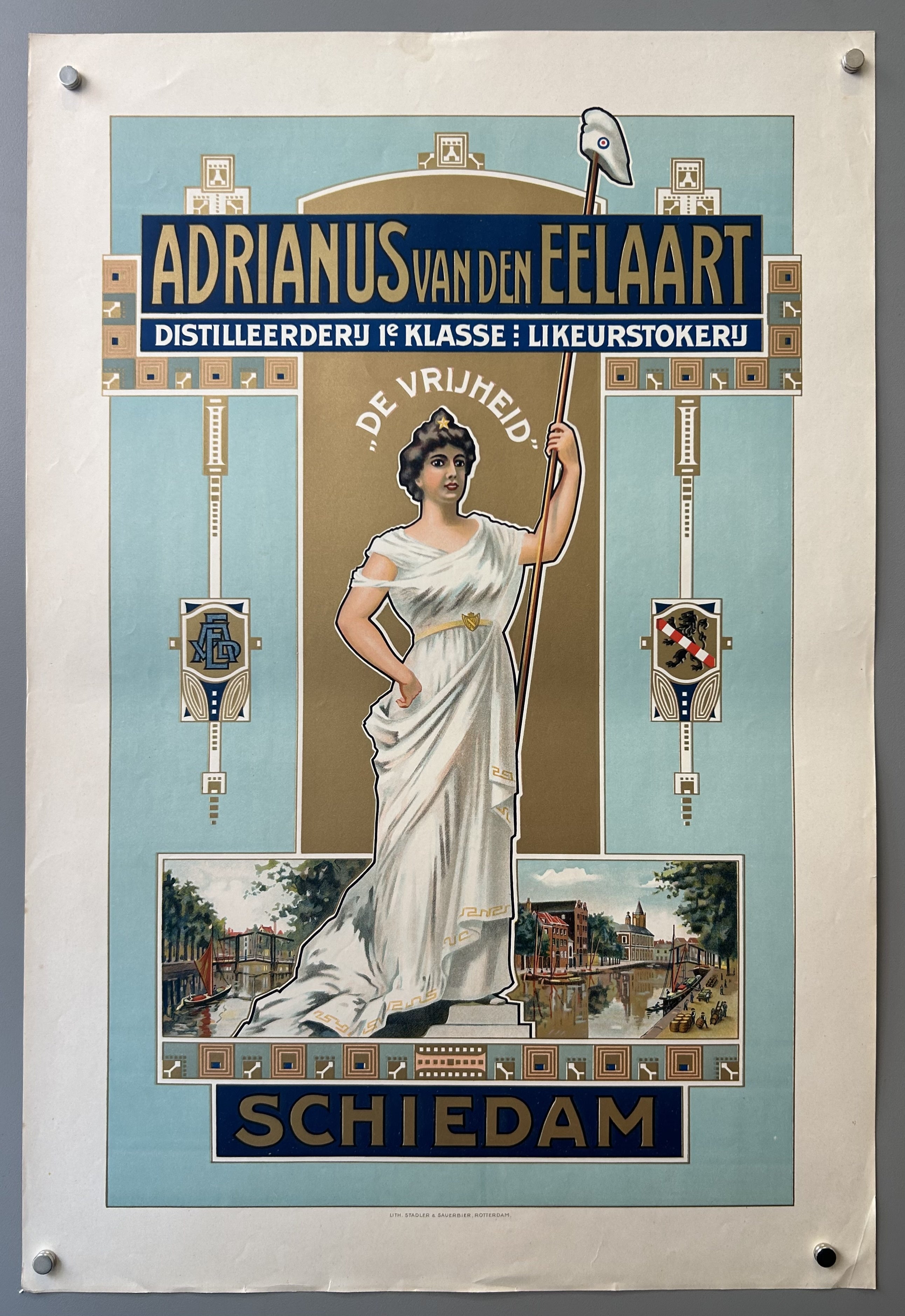 English translation: "Adrianus van den Eelaart. First-Class Distillery Liqueur Distillery De Vrijheid , Schiedam."