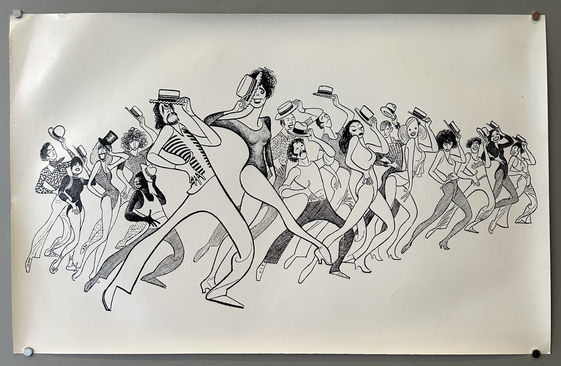 Illustration depicts the cast of the musical A Chorus Line from 1975, capturing the dynamic energy and iconic poses of the dancers.