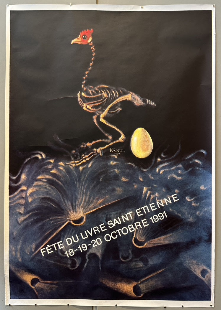 The poster features a surreal image of a chicken skeleton with a red comb and wattle, accompanied by a golden egg, emerging from stylized representations of open books, suggesting a connection between literature, life, and creation