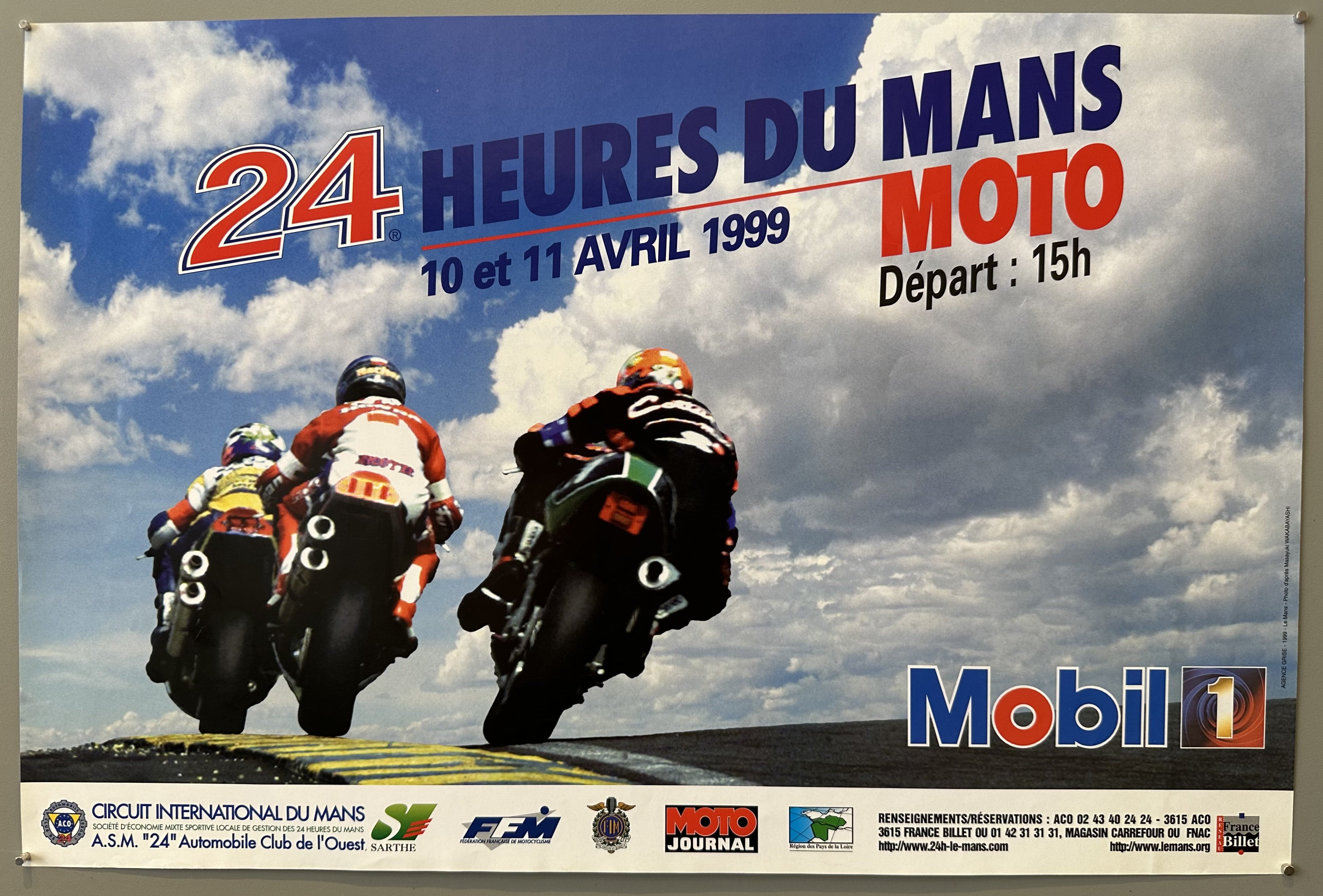 Three motorcycles head over a hill, a blue sky with clouds making up the background. This splashy photo advertises the annual Le Mans series of vehicle races held in western France. Motorcycles are head to head in a vicious race for number one.