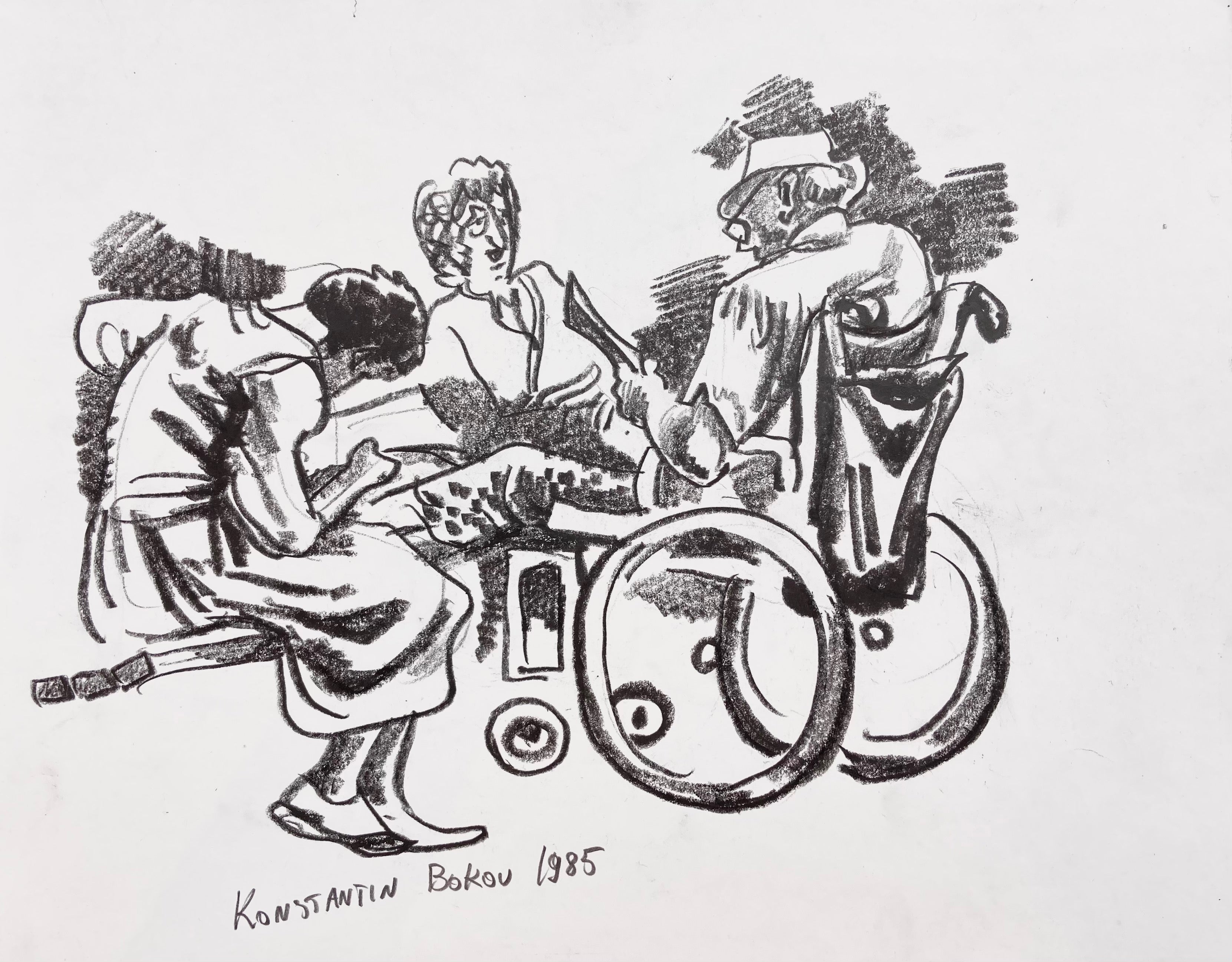 A Chat Outside Konstantin Bokov Charcoal Drawing
