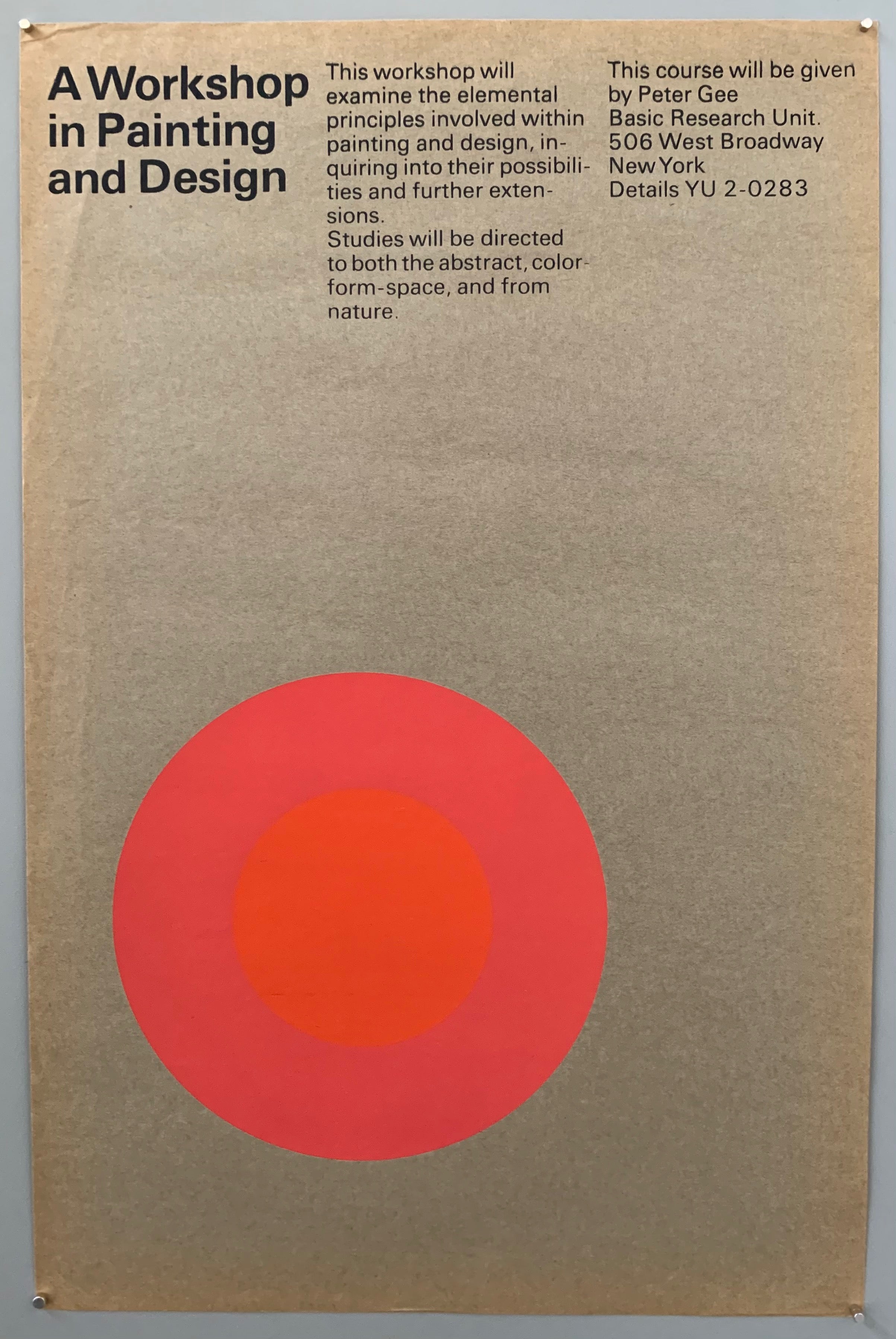 Original silkscreen poster by artist Peter Gee for a workshop on painting and design taught by Peter Gee himself. The workshop examined "the elemental principles involved within painting and design" especially inspired from "the abstract, color form space, and from nature." Gee's genius for design is demonstrated on the poster itself: the vibrant pink and orange of the target are striking. The simple design makes each element of the poster stand out all the more.
