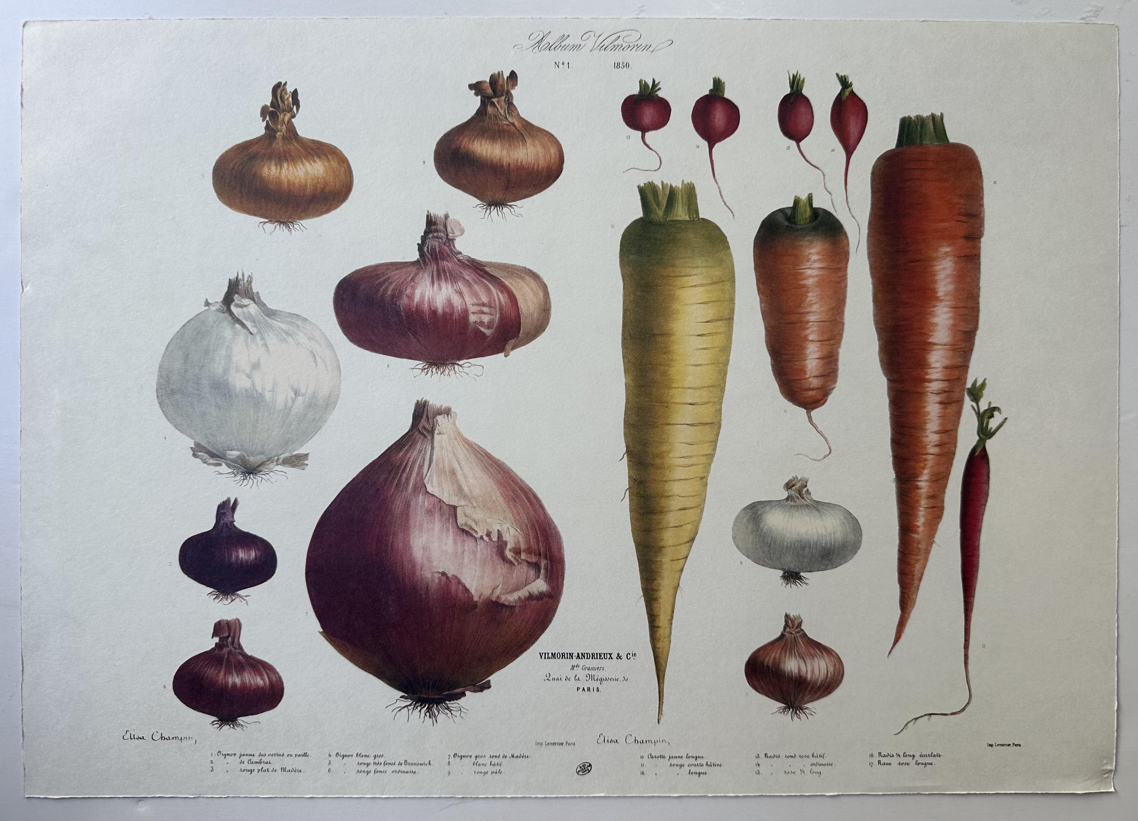 Vilmorin-Andrieux and Company was an important seed company that got its start from printing these plates in 1850, following the expertise of Philippe Victoire de Vilmorin, a merchant and botanist, and his father-in-law Pierre Andrieux, official botanist to the King of France. The company contributed to the advancement of botany and agronomic knowledge of the time. Elisa Champin originally painted and engraved these plates.