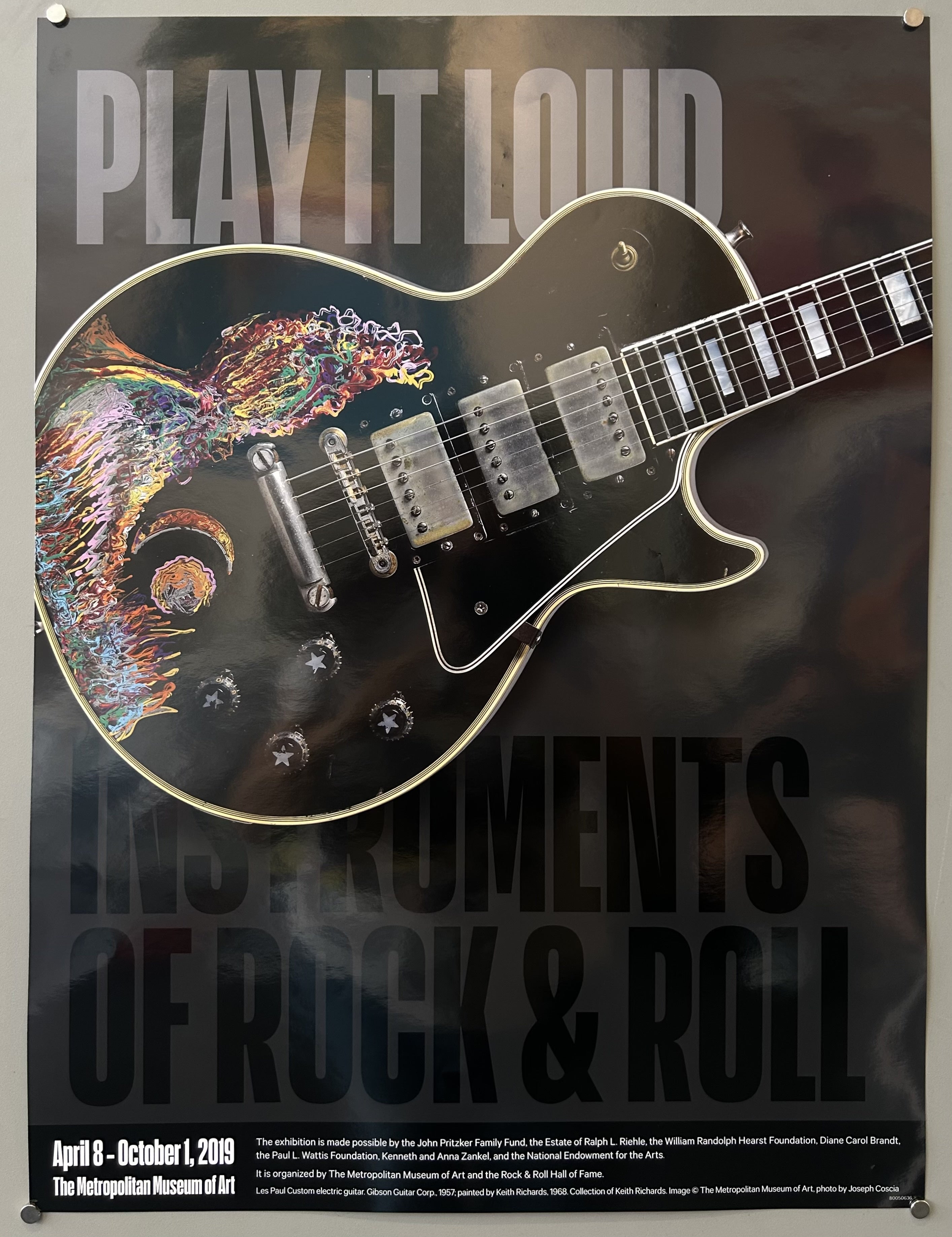 Poster promotes an exhibition at the Met on rock instruments, featuring a photo of a Les Paul Custom electric guitar painted by Keith Richards.