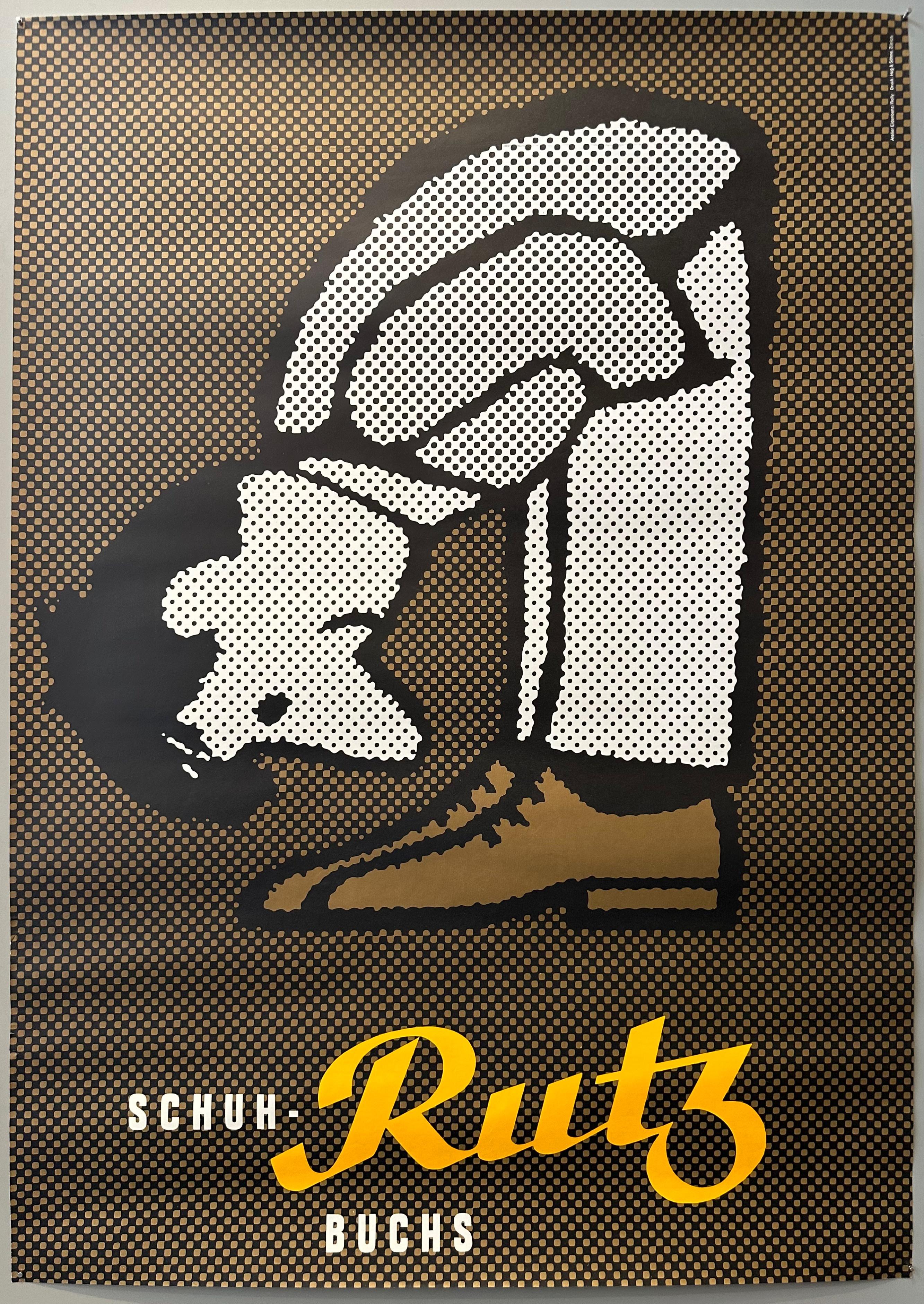 A fun and creative advertising poster of a man smiling down at his shoes for a Swiss shoe company located in Buchs, Switzerland.