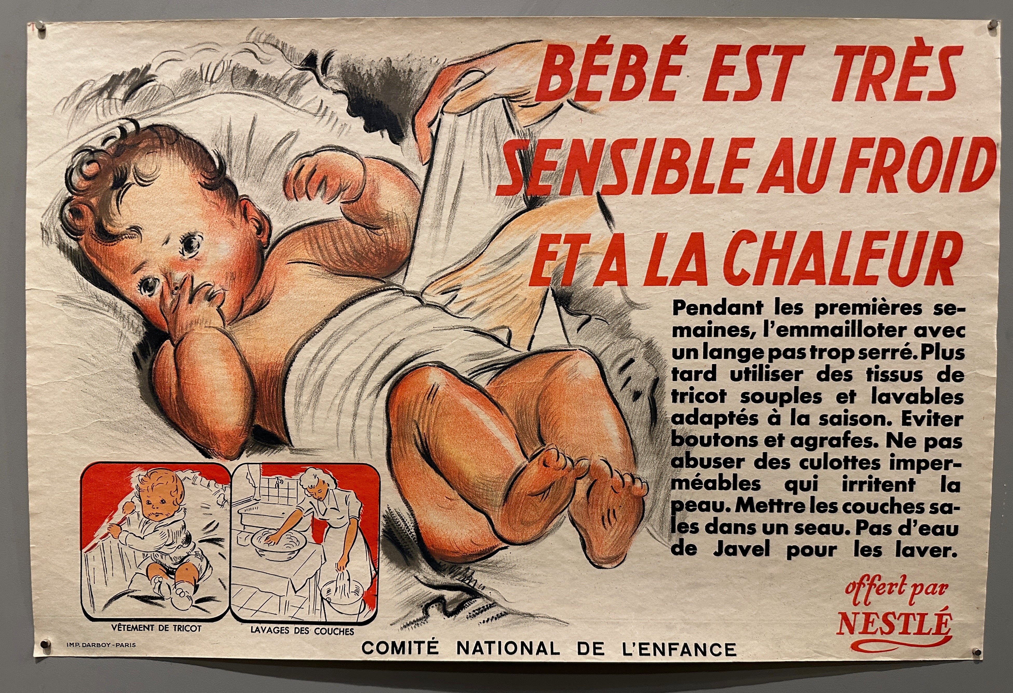 English translation: "Baby is very sensitive to cold and heat / During the first weeks, swaddle him in a diaper that is not too tight. Later use soft, washable knit fabrics suitable for the season. Avoid buttons and hooks. Do not overuse waterproof pants which irritate the skin. Place dirty diapers in a bucket. No bleach to wash them. / offered by Nestlé / National Children's Committee"