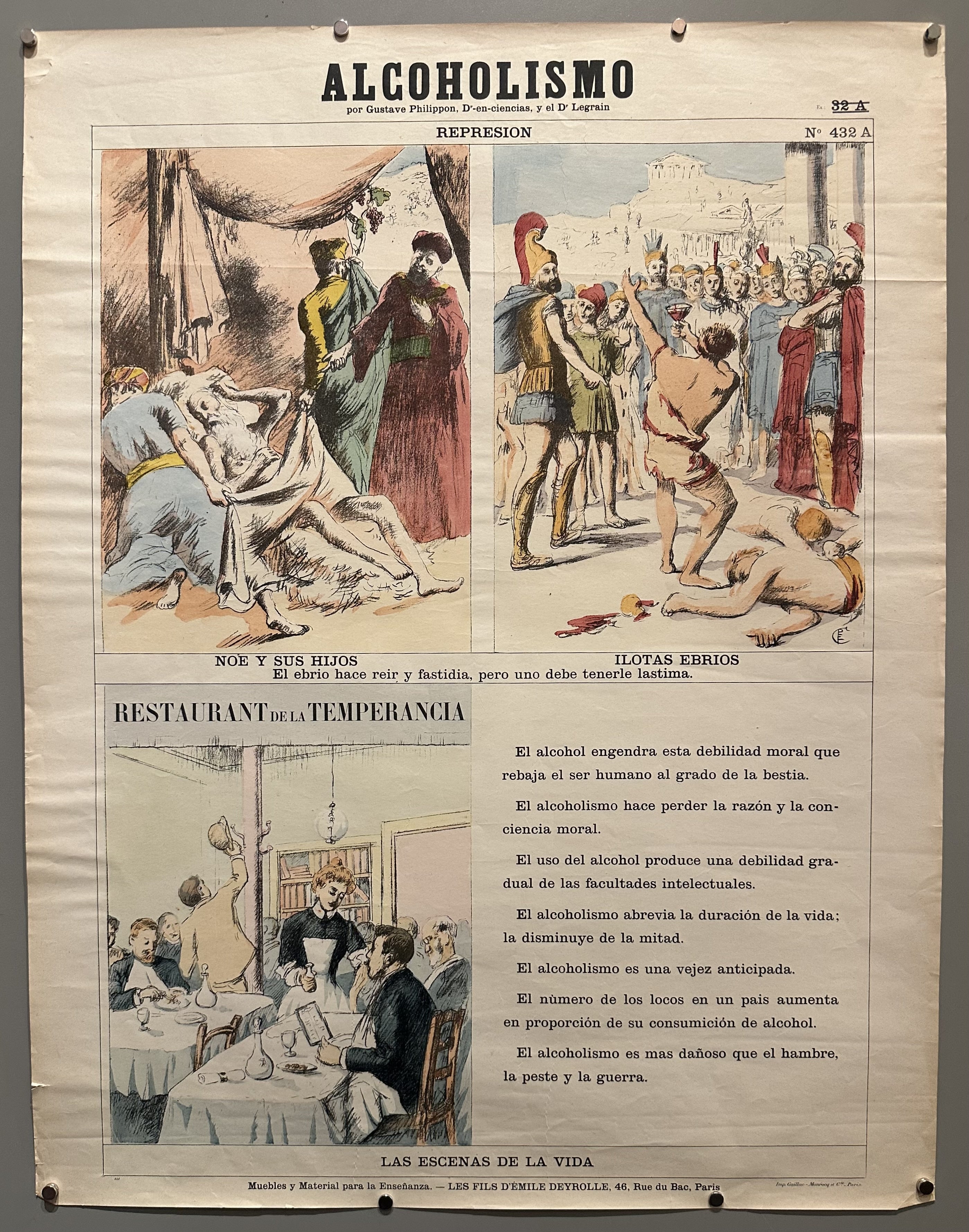 Spanish language version of a French poster warning of the dangers of consuming alcohol created primarily for use in schools as educational material.