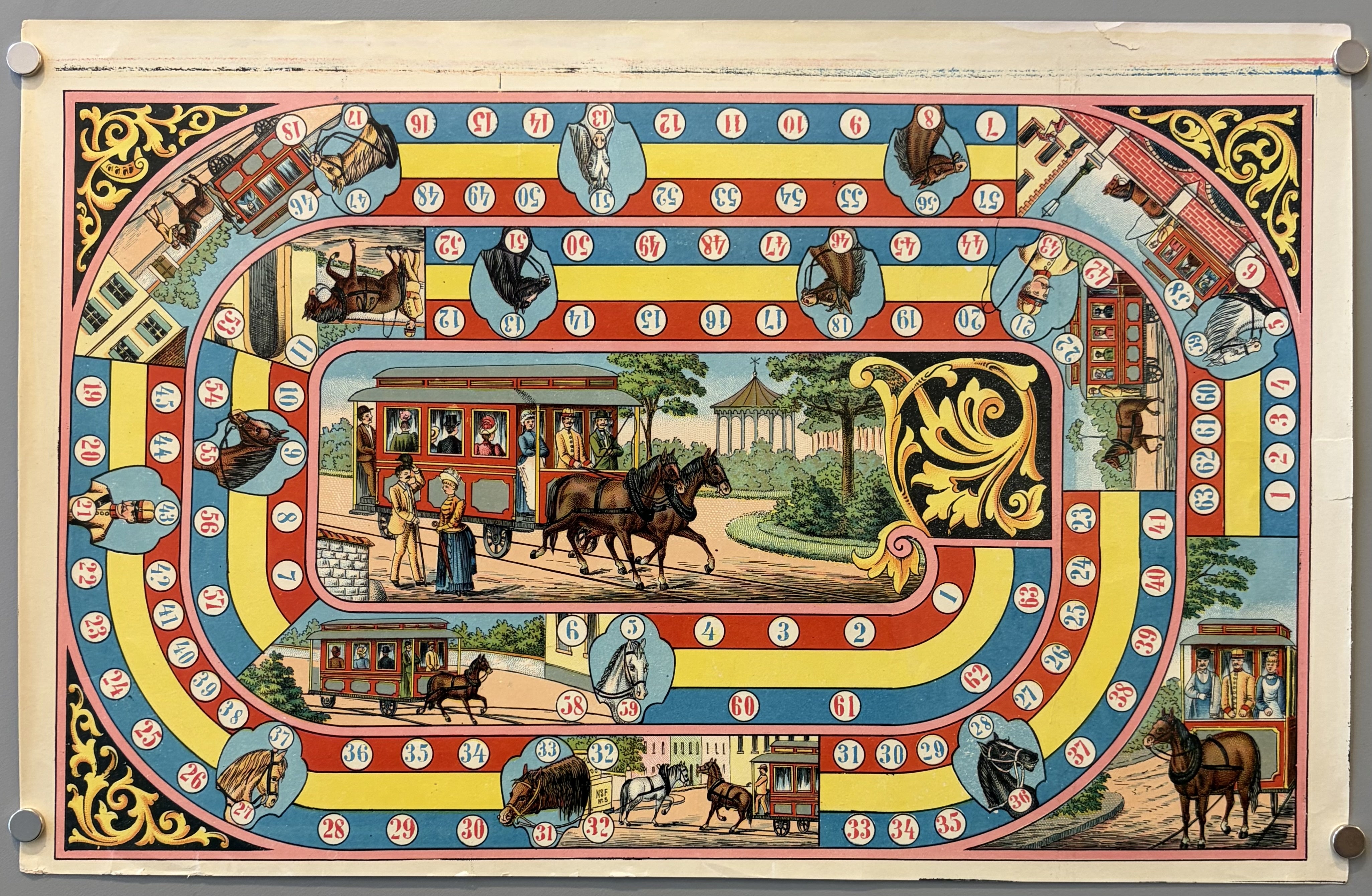 Created by the European School, this vintage piece depicts a spiral-style race game focused on horse-drawn transportation.