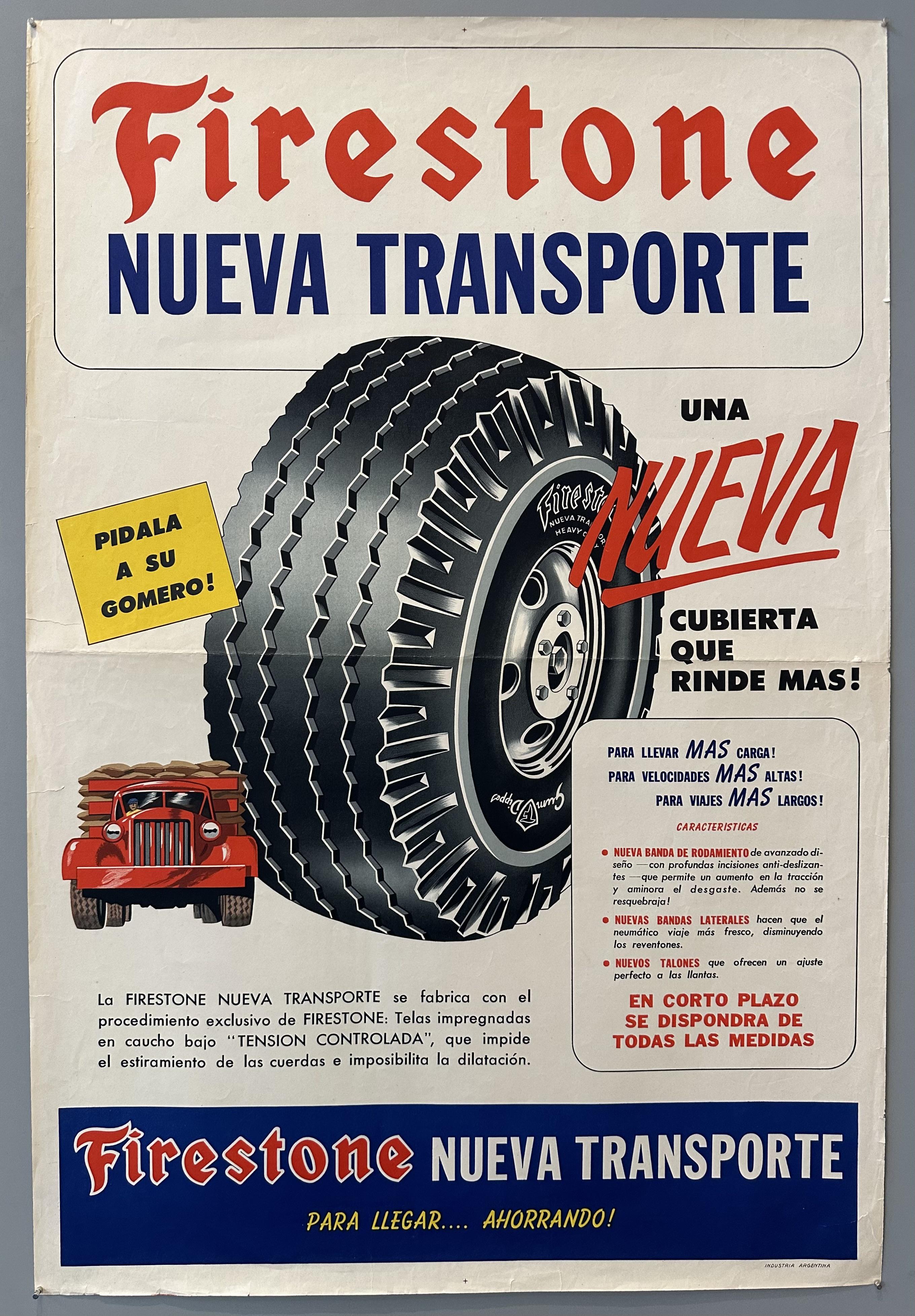 "Firestone Nueva Transporte / Une Nueva Cubierta que Rinde Mas! / Pidala a Su Gomero / La Firestone Nueva Transporte se fabrica con el procedimiento exclusivo de Firestone: Telas impregnadas en caucho bajo 'Tension Controlada', que impide el estiramiento de las cuerdas e imposibilita la dilatación. / Firestone Nueva Transporte / Para Llegar... Ahorrando!"