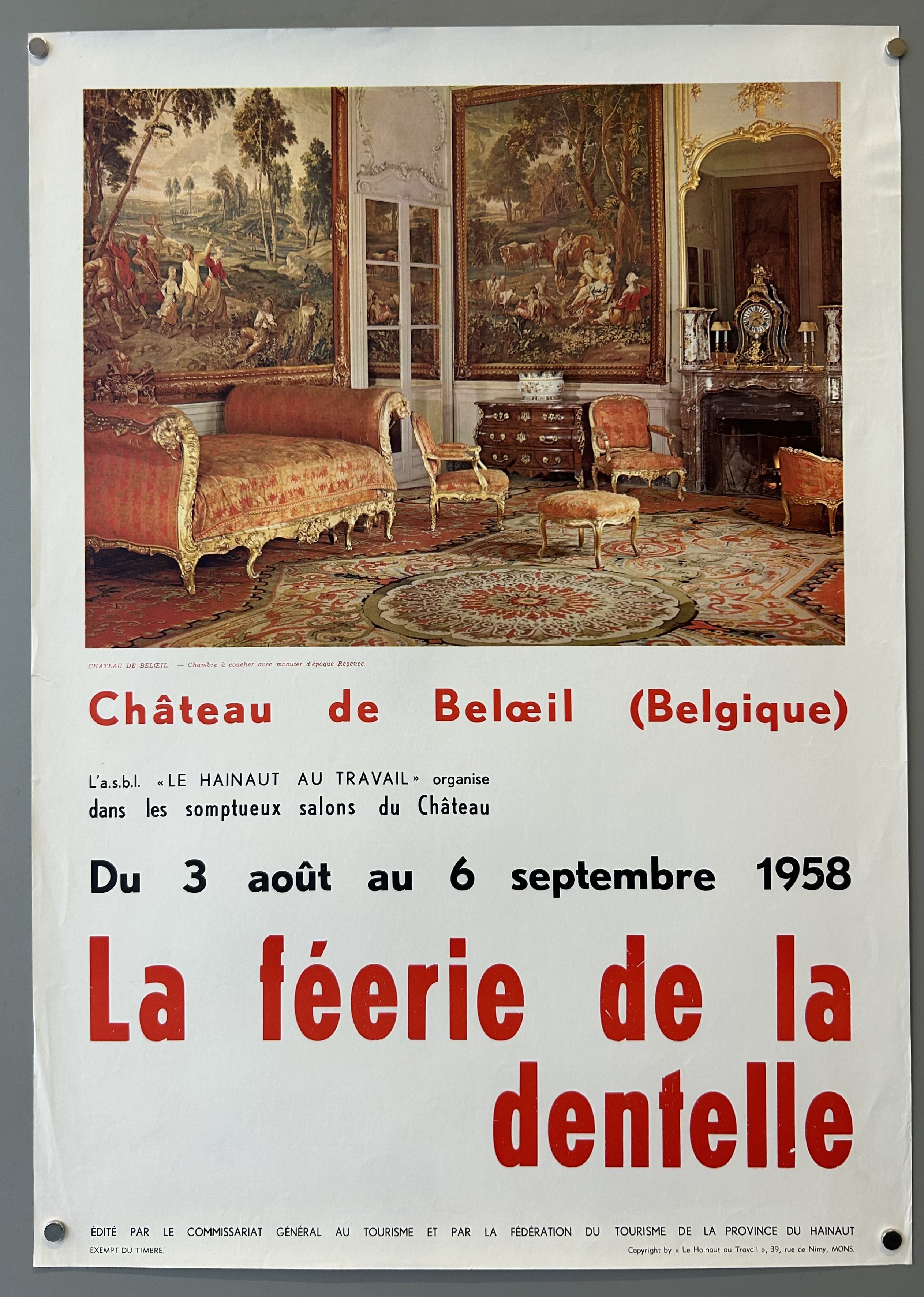 English translation: "Belœil Castle (Belgium) / The non-profit organization 'Le Hainaut au Travail' organizes in the sumptuous salons of the Castle / From August 3 to September 6, 1958 / The Lace Fairyland"