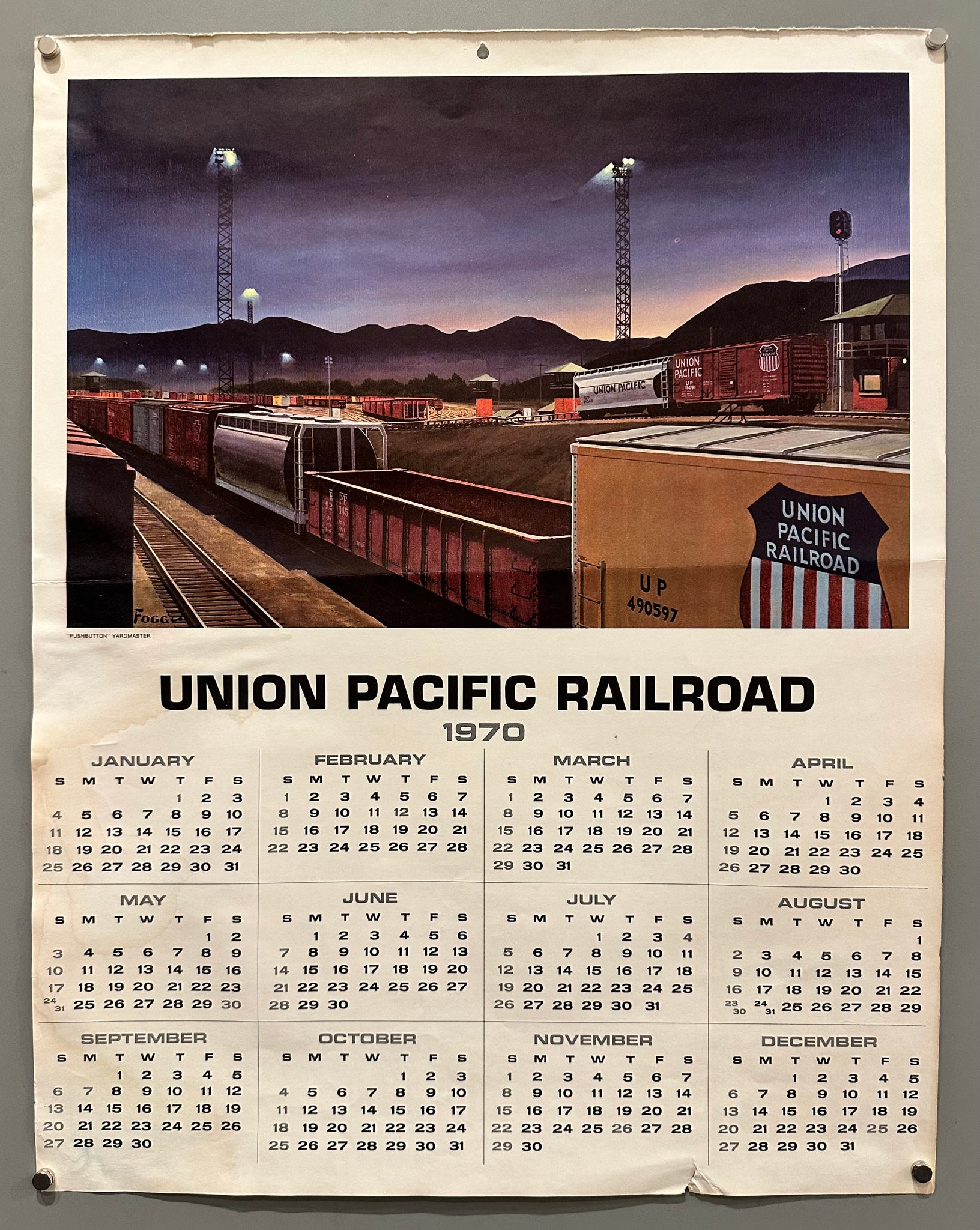 A double-sided calendar from Union Pacific Railroad with a monthly calendar for 1970 on the back.