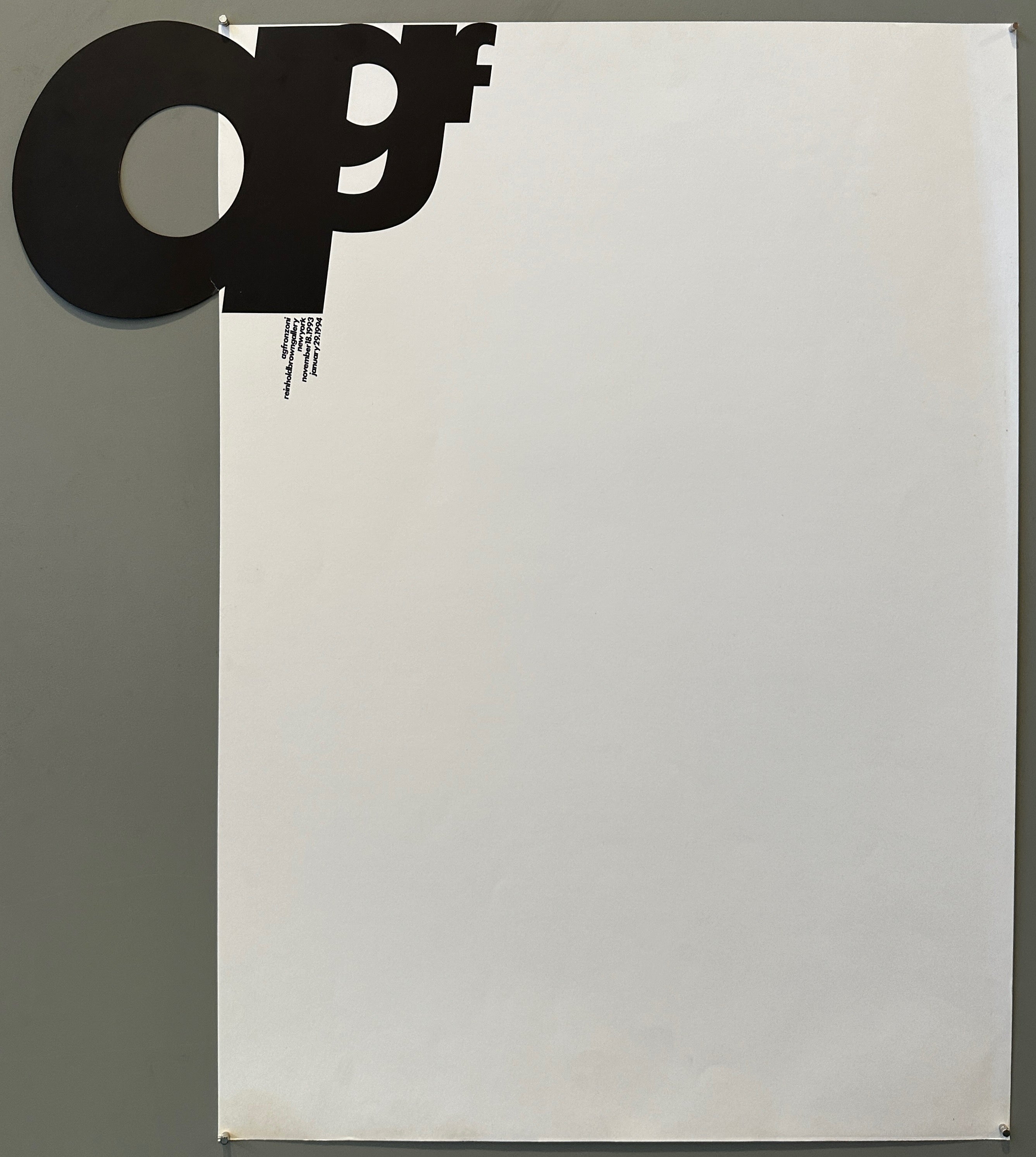 Die-cut poster (top left) promoting an exhibition featuring the work of renowned Italian minimalist graphic designer Angiolo Giuseppe Fronzoni, better known as AG Fronzoni. The exhibition was held in 1993-94 at the Reinhold Brown Gallery in New York. Poster features a design by Fronzoni with exhibition information.