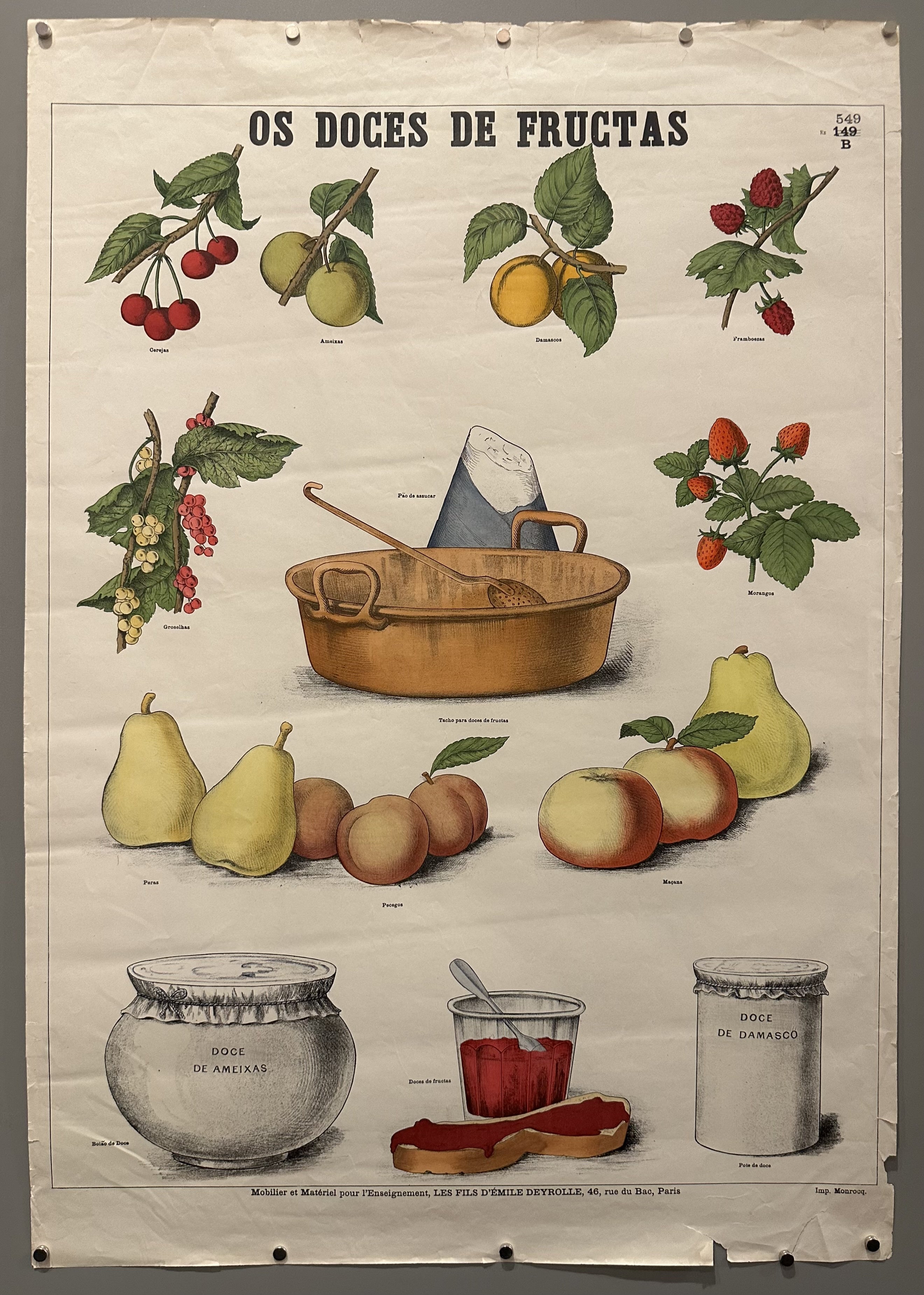 Portuguese language version of a French poster used primarily in schools as educational material. This poster labels various fruits that are typically made into jams.