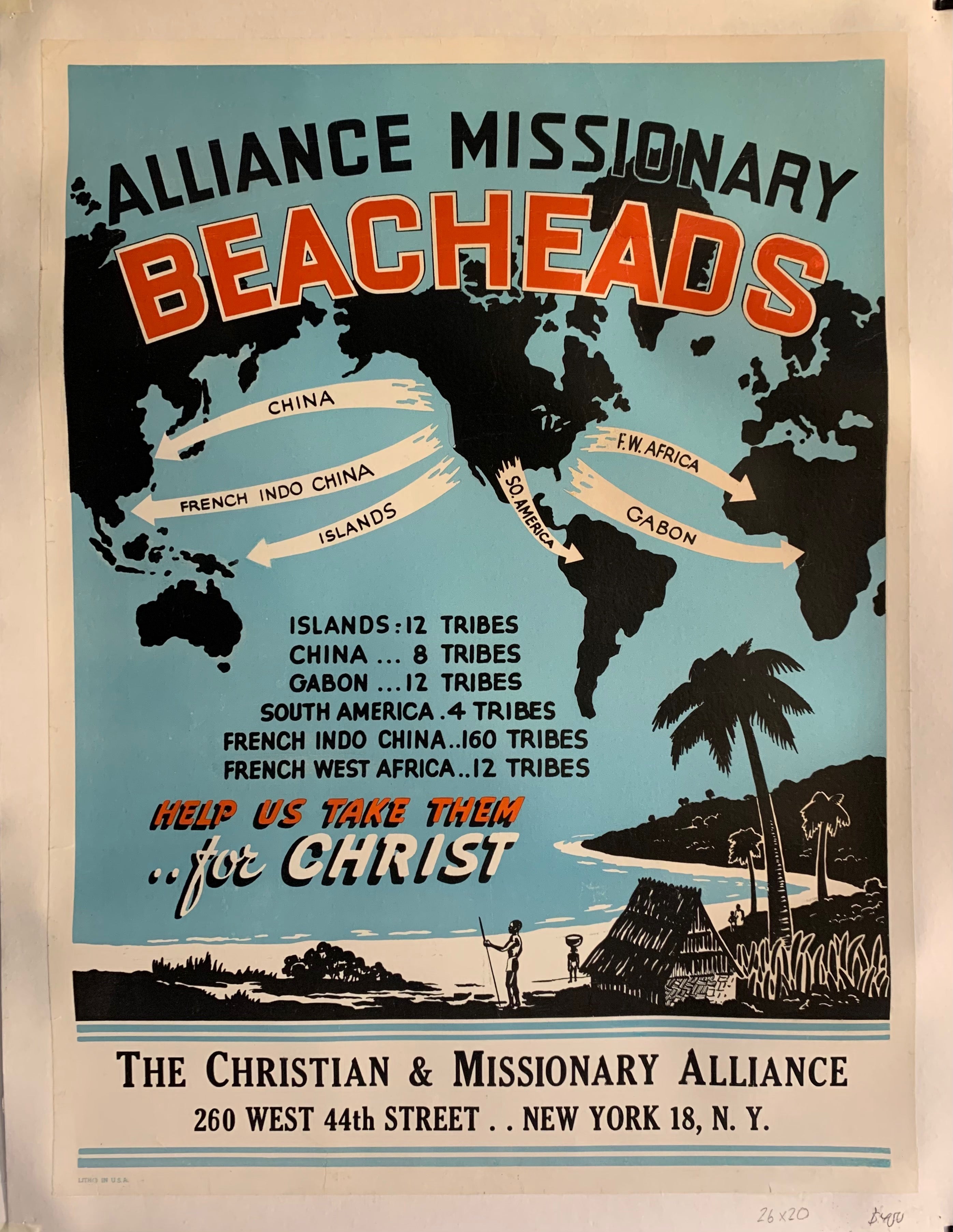 Original vintage poster for a Christian missionary group, encouraging fellow Christians to join their missions in Asia, South America, and Africa. A rare relic of history.