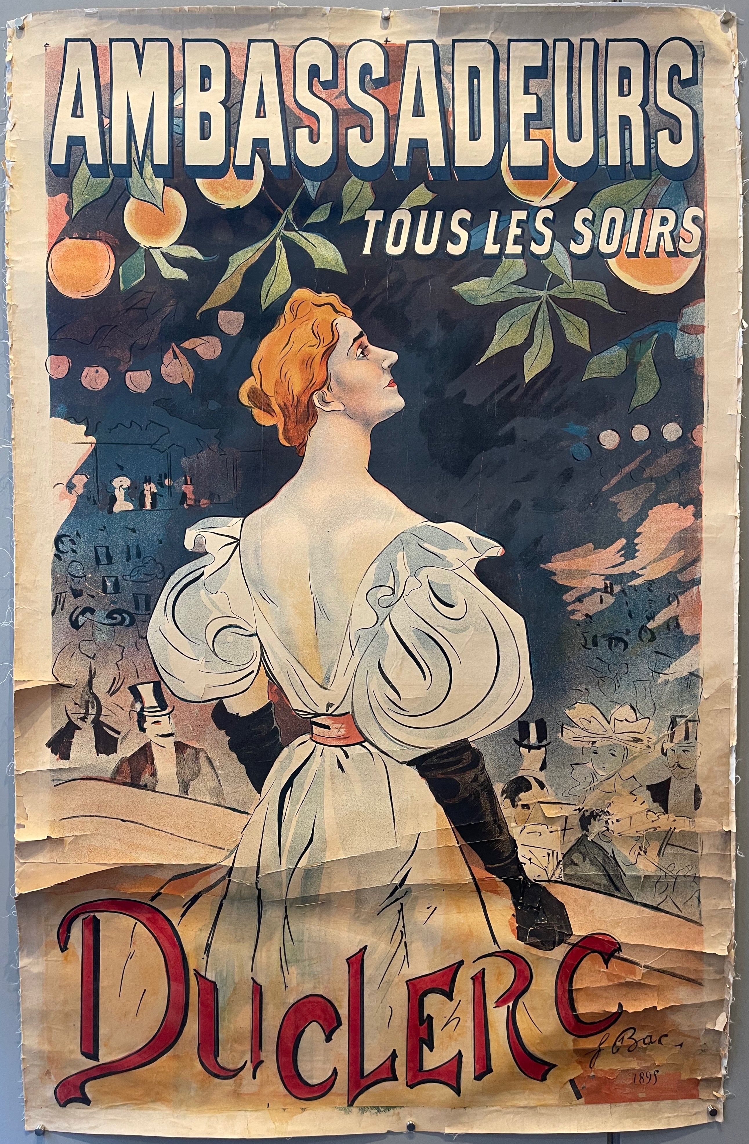 Beautiful poster featuring art by French-German artist Ferdinand-Sigismund Bach of performer Yvette Guilbert onstage for her nightly revue at the Ambassadeurs. Guilbert and Bach were lifelong friends, and Bach created various prints of her. Artist signature and date in bottom right.