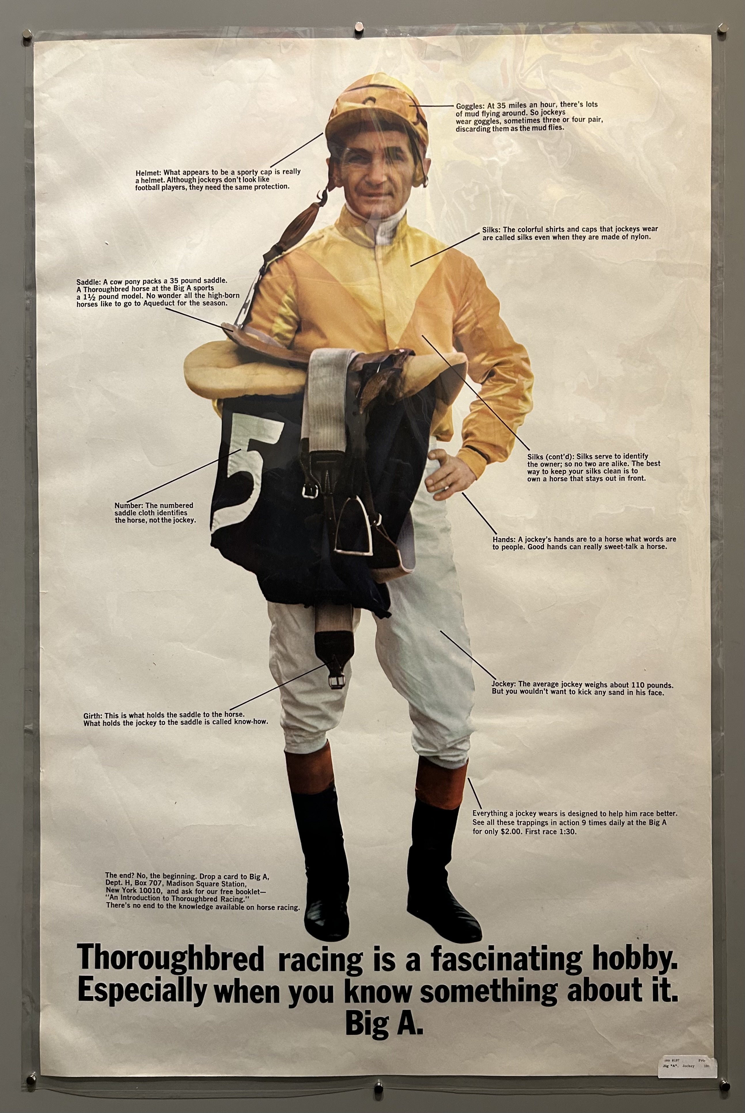 Detailed poster explaining each facet of a jockey and his uniform to promote a free booklet: "An Introduction to Thoroughbred Racing".