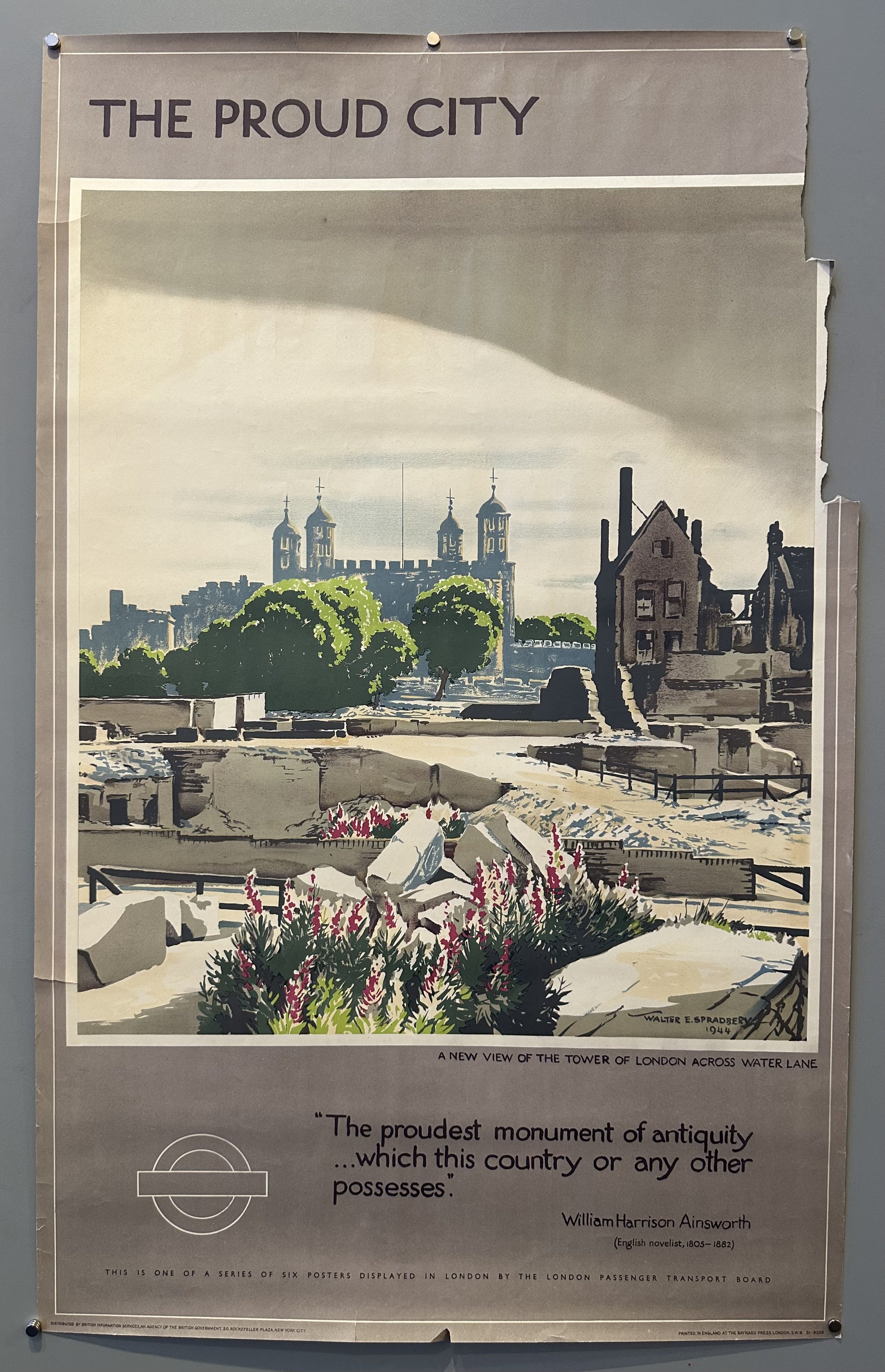 "The Proud City / A New View of the Tower of London Across Water Lane / 'The proudest momument of antiquity...which this country or any other possesses.' William Harrison Ainsworth (English novelist, 1805-1882) / This is one of a series of six posters displayed in London by the London Passenger Transport Board"