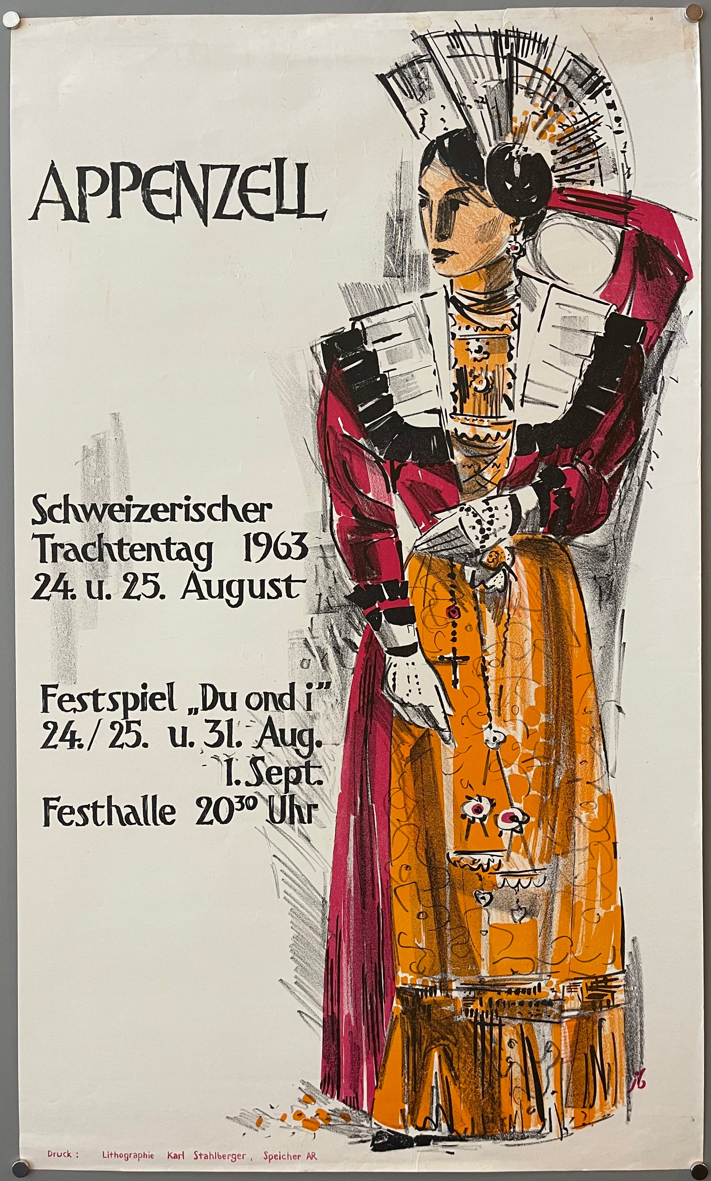 Original vintage poster for a costume festival in Appenzell, Switzerland. The poster features a sketch of a woman in traditional Swiss dress, the tradition of her costume contrasted with the modern artstyle it is rendered in.