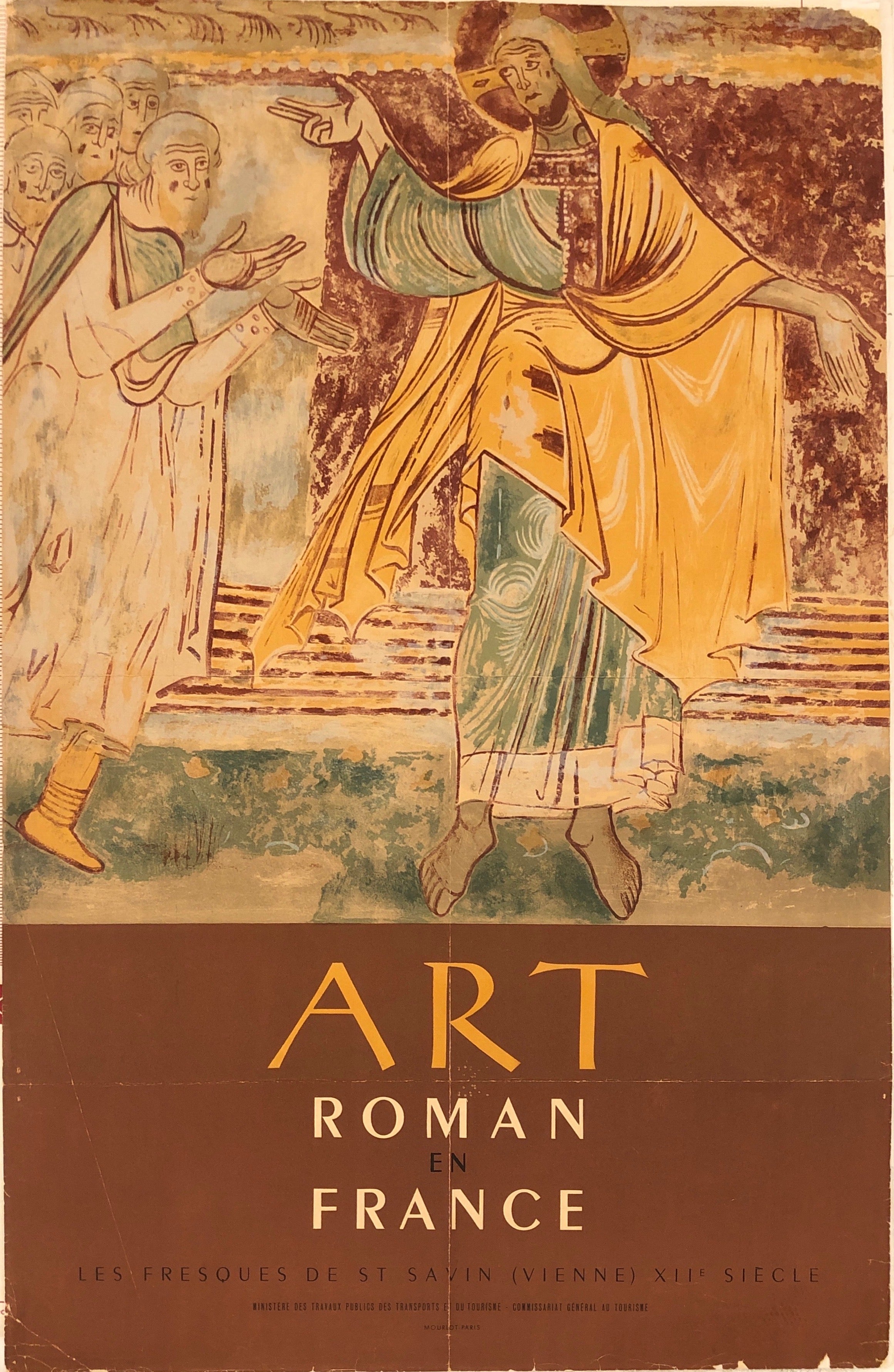 Vintage French poster advertising an exhibition of 12th Century frescos of St. Savin from Vienna. The poster features one such fresco that will be exhibited, the early Christian art truly a delight to any amateur art historian.