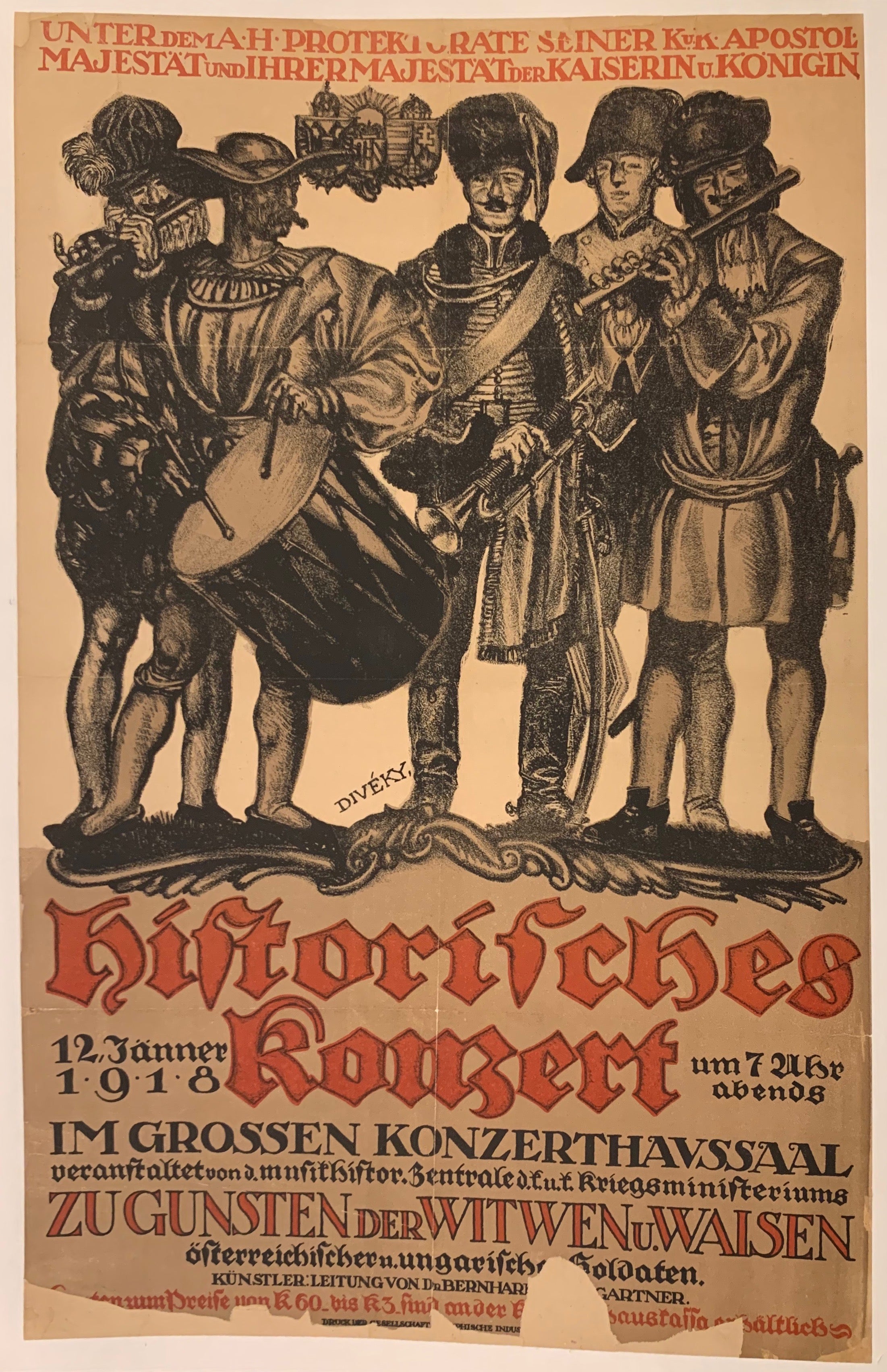 Vintage poster advertising a concert for the benefit of the widows and orphans of Austro-Hungarian soldiers killed in World War I. The text on the poster lists the emperor and empress of the Austro-Hungarian Empire as patrons of the concert, alongside support from the Ministry of War. Illustrated on the poster are five military musicians, and drawn amongst this group of musicians is Austria-Hungary's coat of arms. The poster is from a collection of German propaganda material that was confiscated by U.S. military intelligence authorities after Germany's defeat in World War II and transferred to the Library of Congress.
