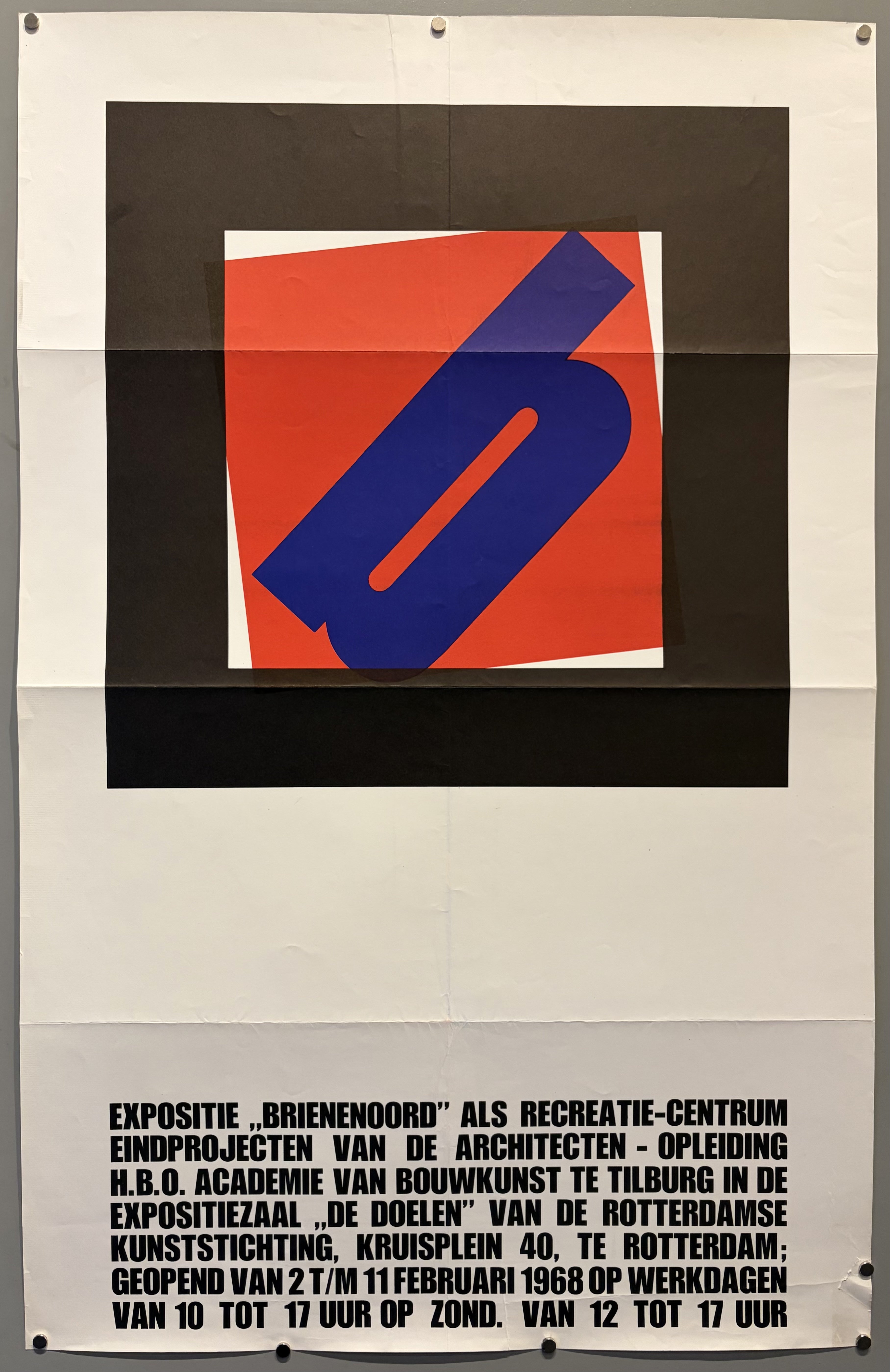 English Tranlsation: " Exhibition "Brielenoord" as a recreation center: final projects of the architecture students of the HBO Academy of Architecture in Tilburg, in the exhibition hall "De Doelen" of the Rotterdam Art Foundation, Kruisplein 40, Rotterdam:Open from February 2nd to 11th, 1968, on weekdays from 10 am to 5 pm, and on Sundays from 12 pm to 5 pm."