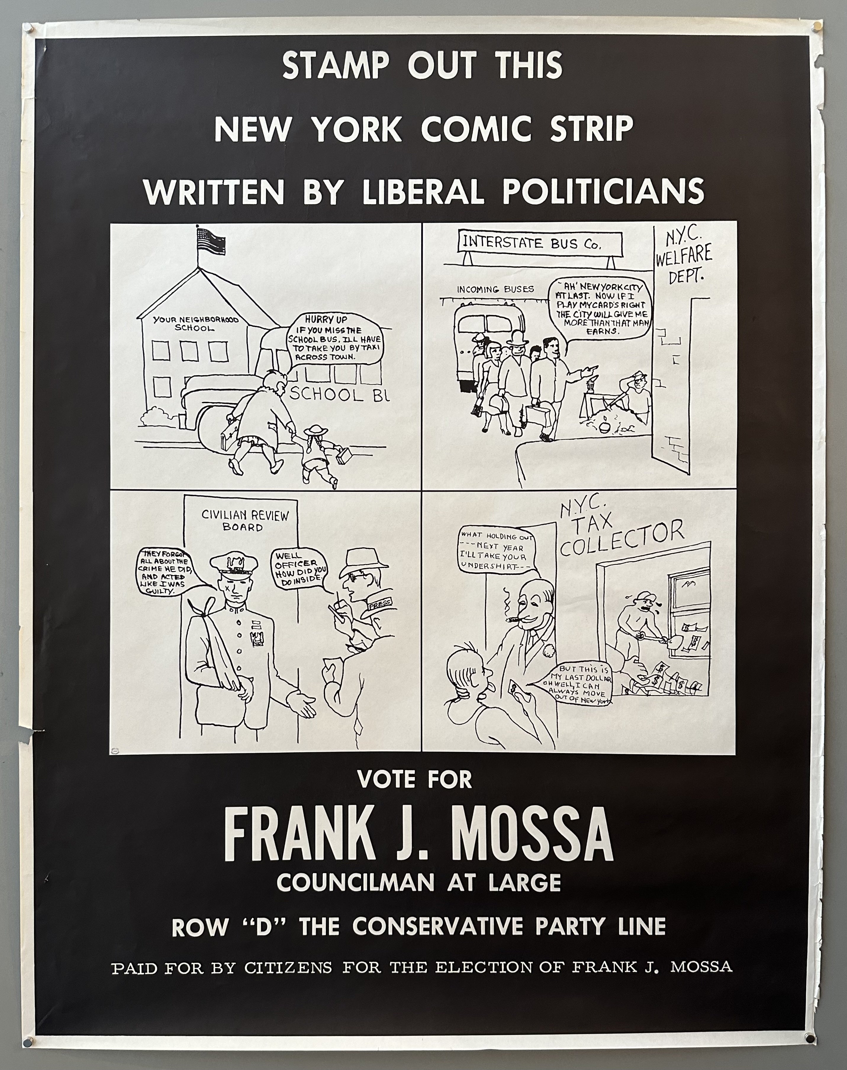 "Stamp Out This New York Comic Strip Written by Liberal Politicians / Vote for Frank J. Mossa / Councilman at Large / Row 'D' the Conservative Party Line / Paid for by Citizens for the Election of Frank J. Mossa"