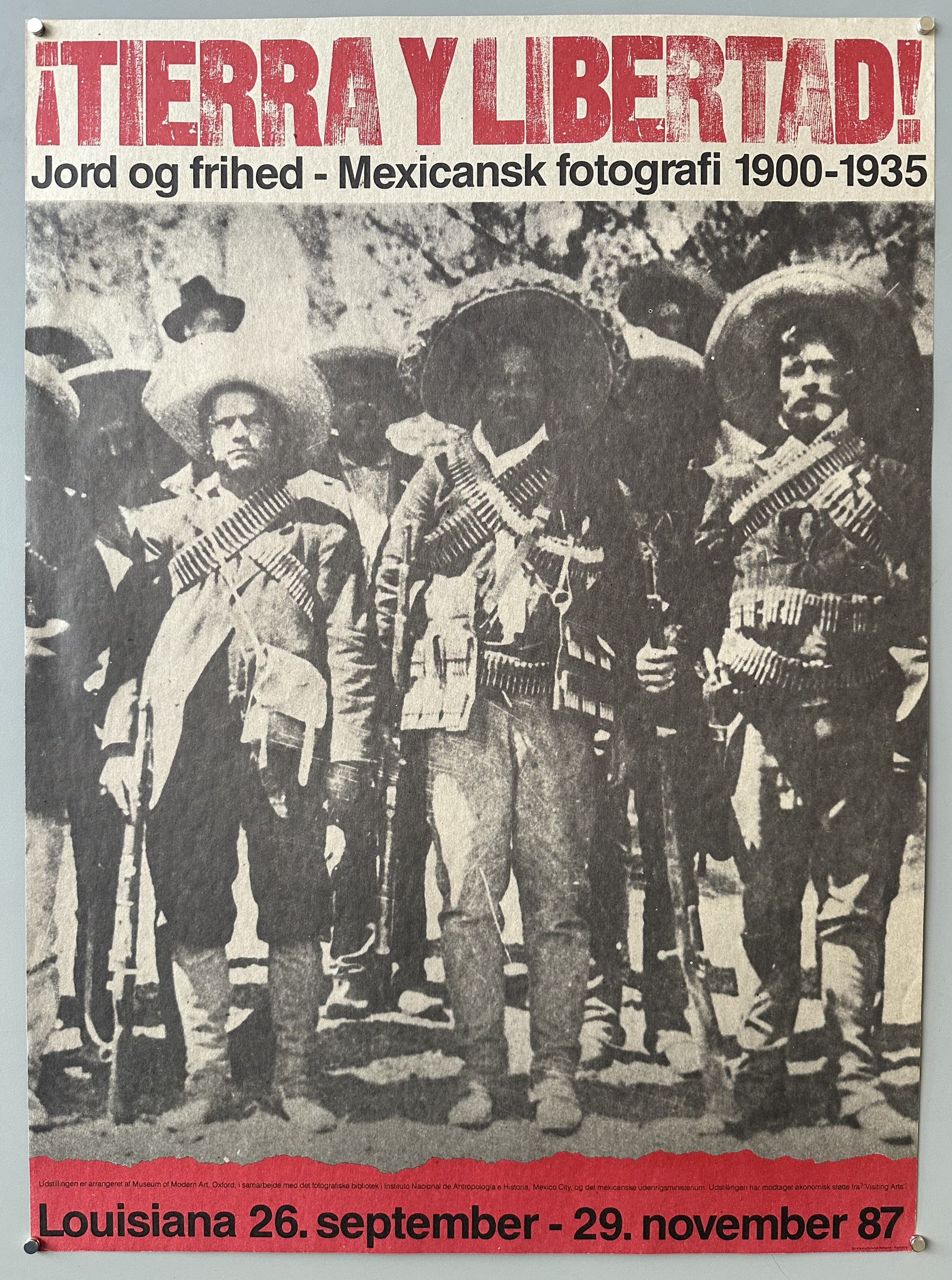 English translation: "Land and Freedom! / Land and Freedom- Mexican Photography 1900-1935 / Louisiana September 26 - November 29 87 / The exhibition is organized by the Museum of Modern Art, Oxford, in collaboration with the photographic library of the Instituto Nacional de Antropologia e Historia, Mexico City, and the Mexican Ministry of Foreign Affairs."