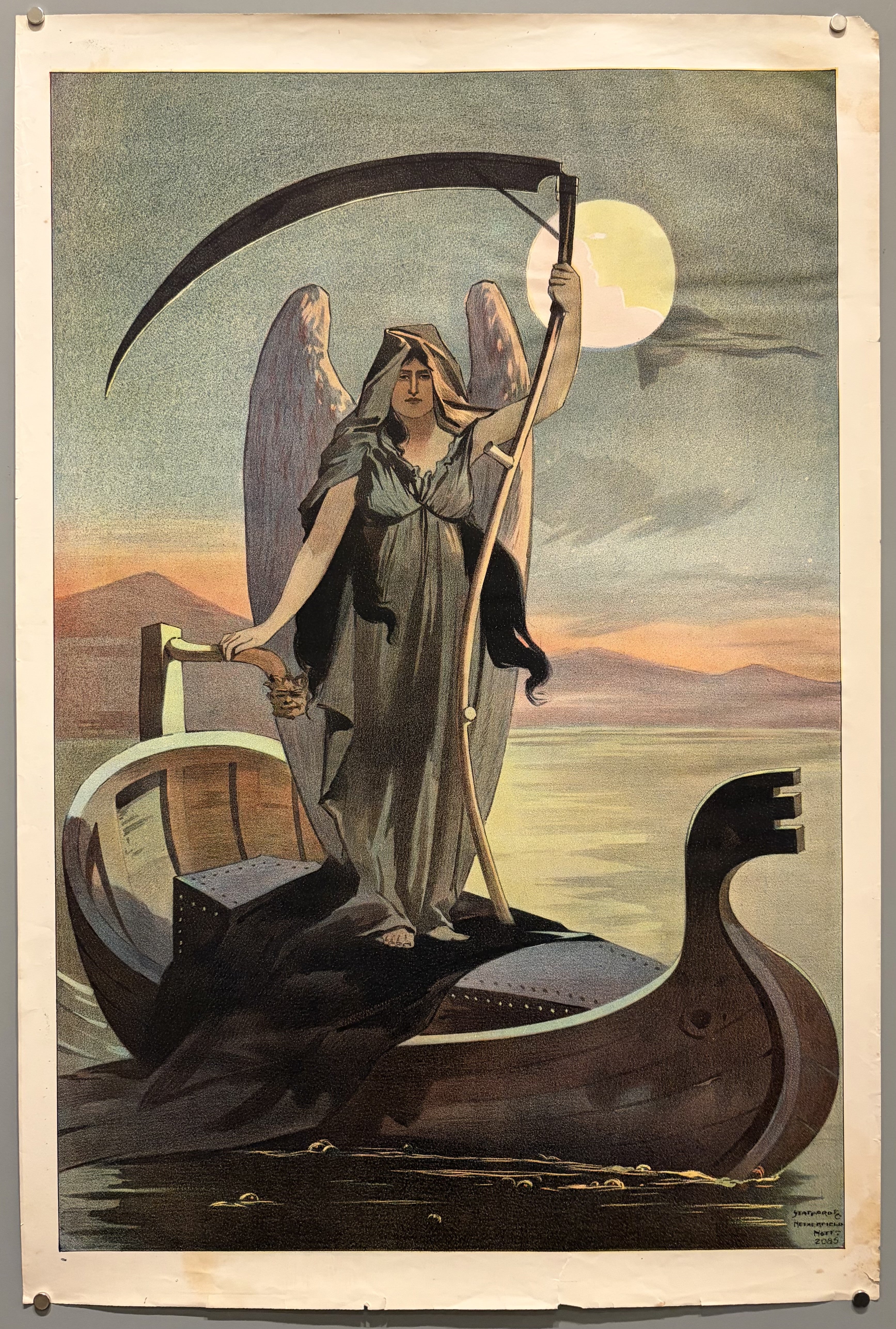 Print of an illustration of an angel holding a scythe while standing on a boat, perhaps symbolizing death.