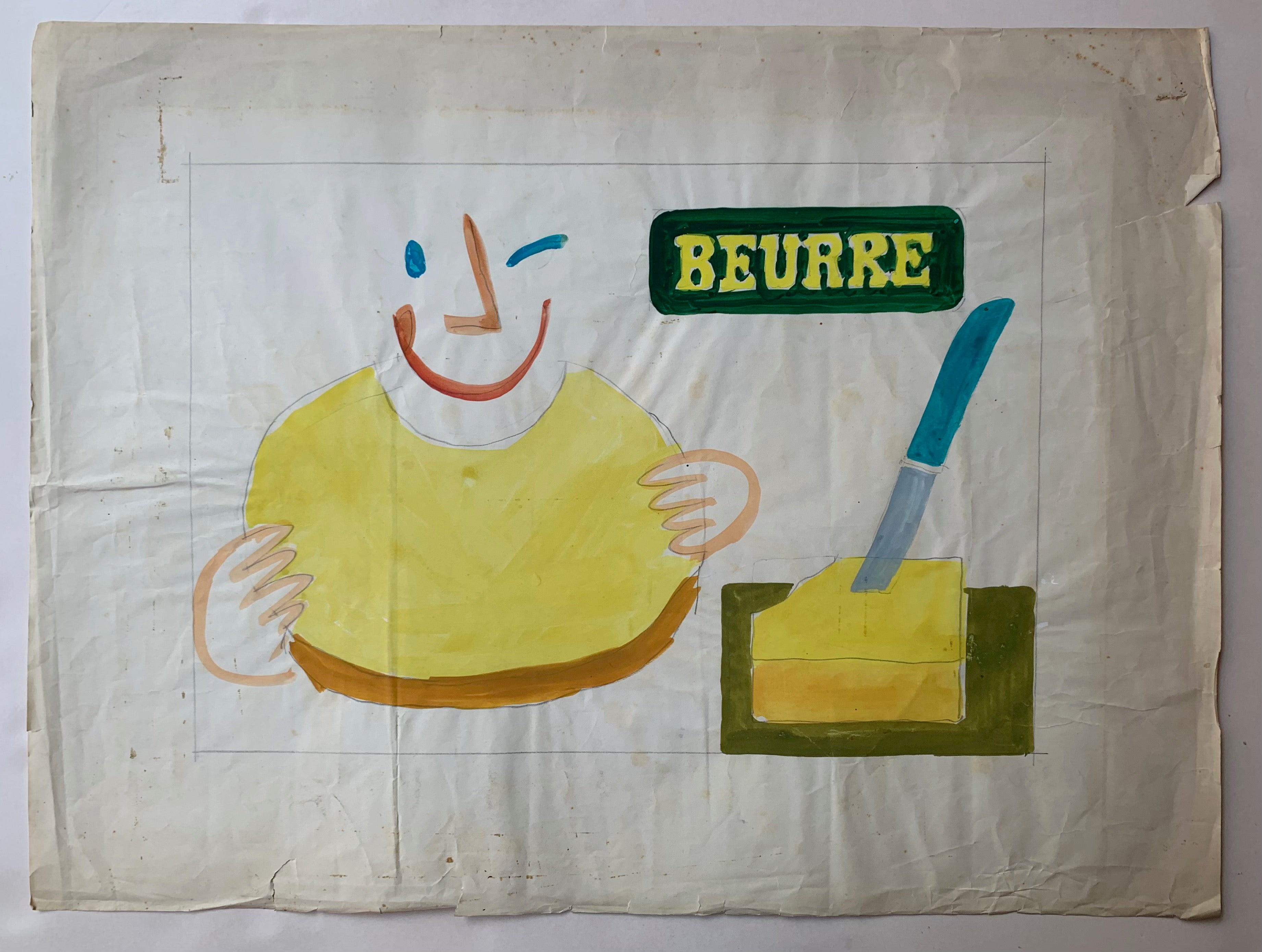 Image: Horizontal product. A man drawn in an abstract fashion is winking at a stick of butter with a knife in it. He has a rotund yellow body that is colored in, outlined hands, and an outlined face. The "Beurre" logo is prominently portrayed next to him, with a green rectangle underneath the yellow block lettering.