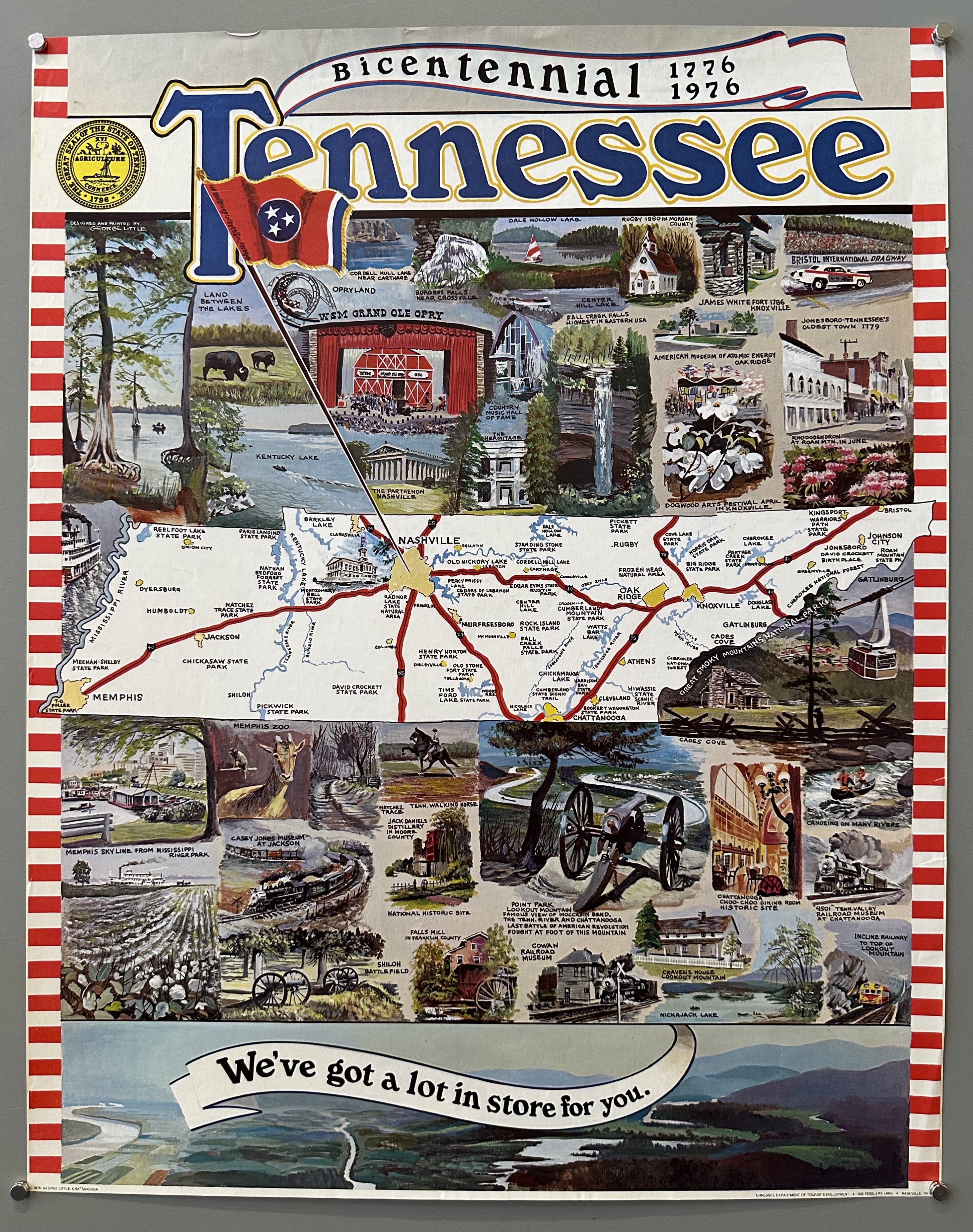 Celebrating the 200th year anniversary of the state of Tennessee, from 1776 to 1976. A map of the state with imagery of the highlights creates a beautiful print in promotion of tourism.