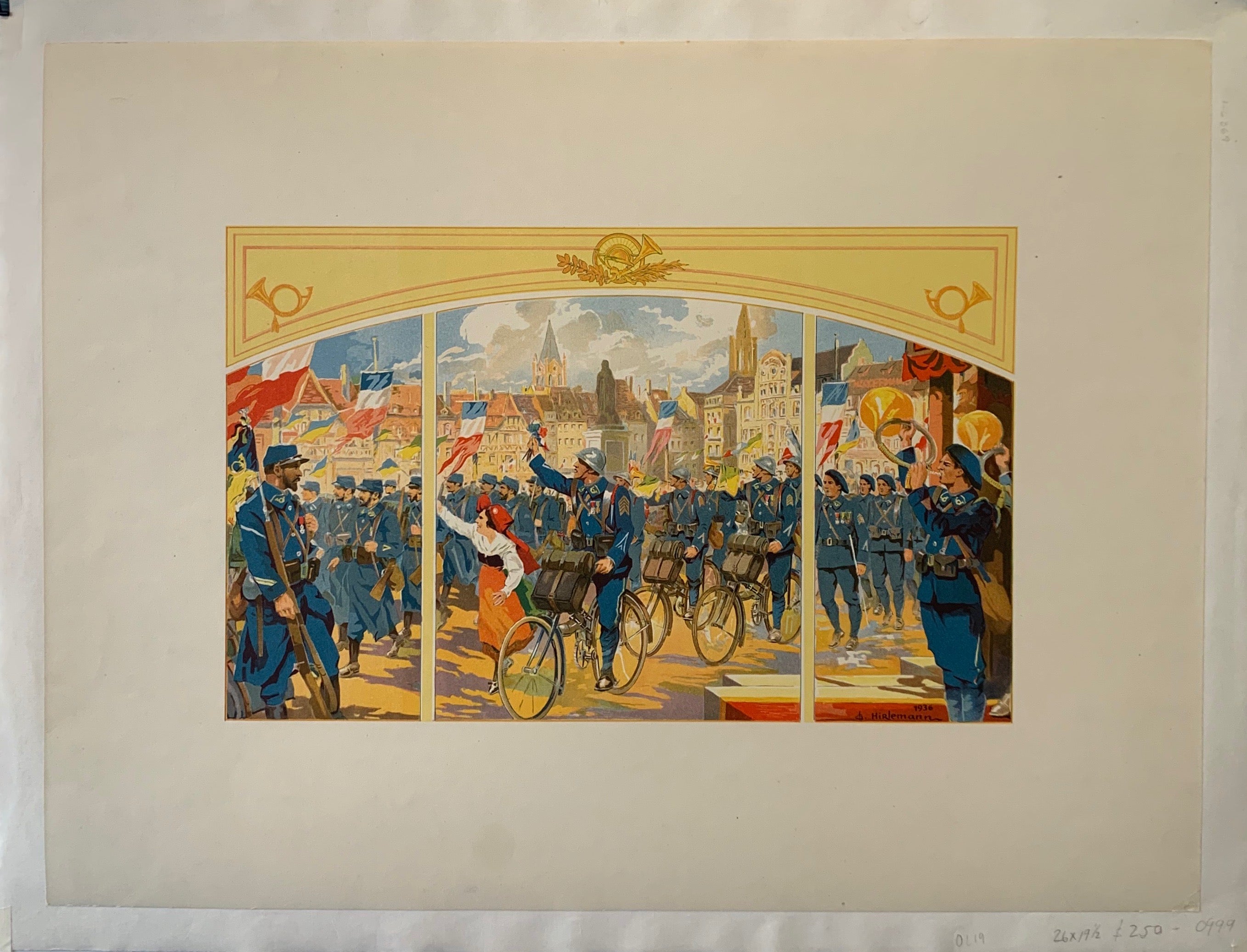 100-250 250-500 art bicycle celebration cycling flags france french gun horizontal poster march original size-26x20 soldier transportation trumpet tryptich victory vintage war